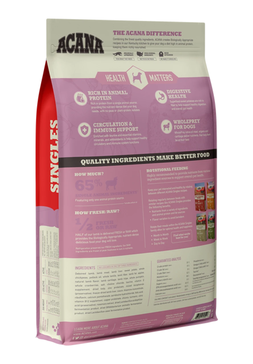 ACANA Lamb & Apple features one single, easily digestible animal protein. Fresh and raw lamb meat, organs, and cartilage or bone are delivered in WholePrey ratios and supply virtually all the necessary nutrients, vitamins, and amino acids naturally and completely.