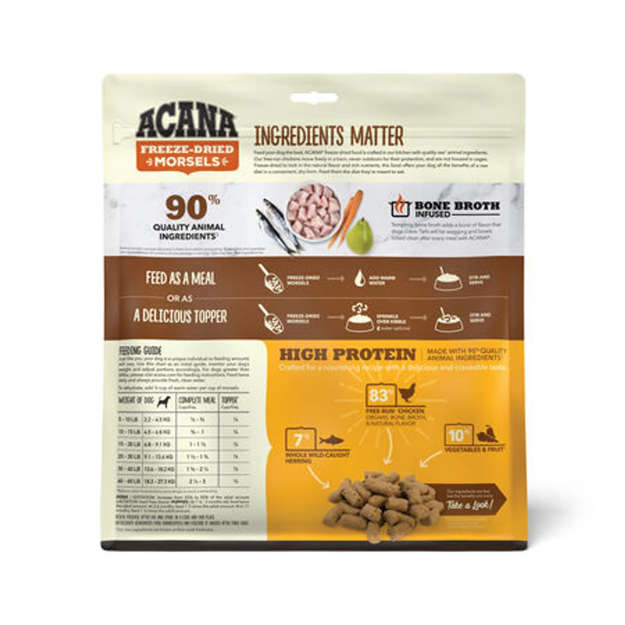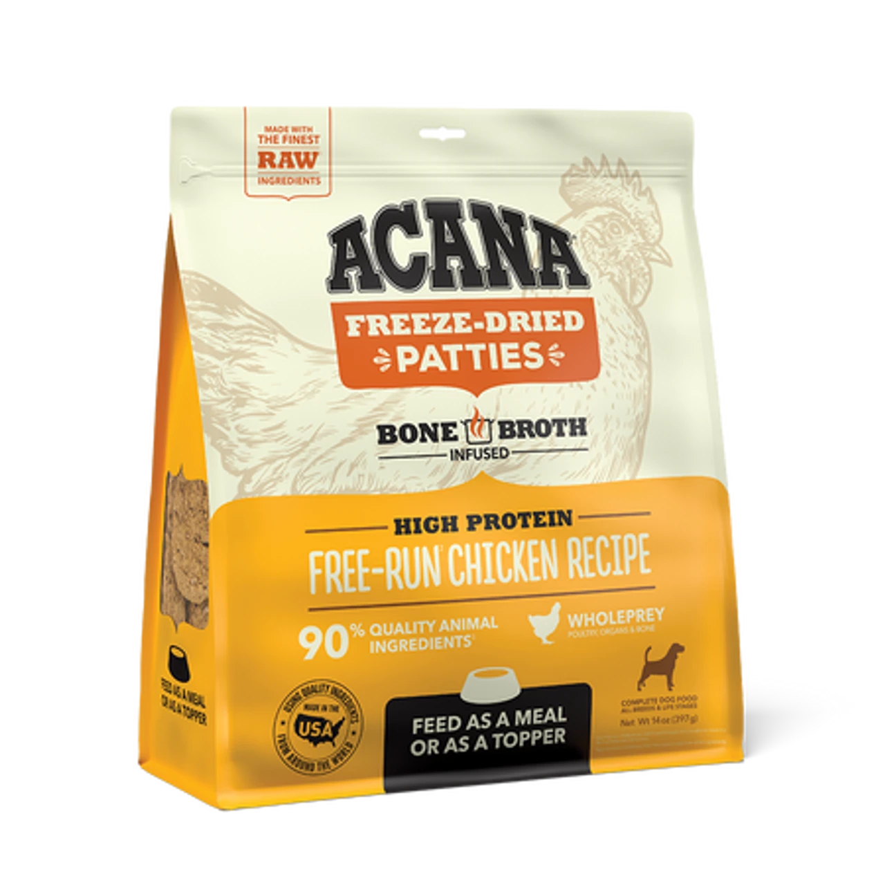 With all the benefits of raw nutrition and none of the mess, ACANA® Freeze-Dried Food, Free-Run Chicken Recipe satisfies your dog’s natural cravings in a convenient, freeze-dried form. Made from *90% quality animal protein from ranch-raised beef and infused with delicious bone broth, you can serve morsels on their own or as a topper at mealtime.