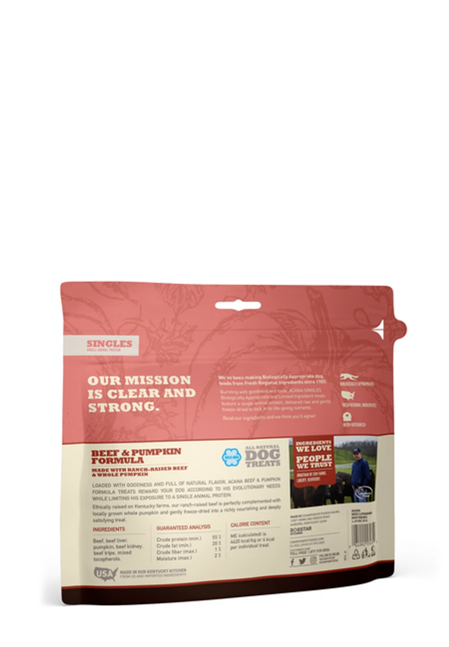 Loaded with goodness and full of natural flavor, ACANA Beef & Pumpkin Treats reward your dog according to his evolutionary needs while limiting his exposure to a single animal protein.