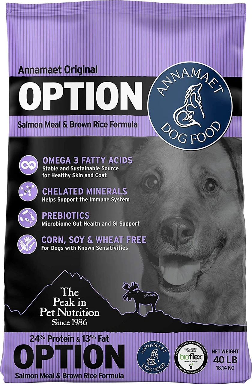 - Annamaet Option is made with salmon and free range, grass fed lamb along with brown rice