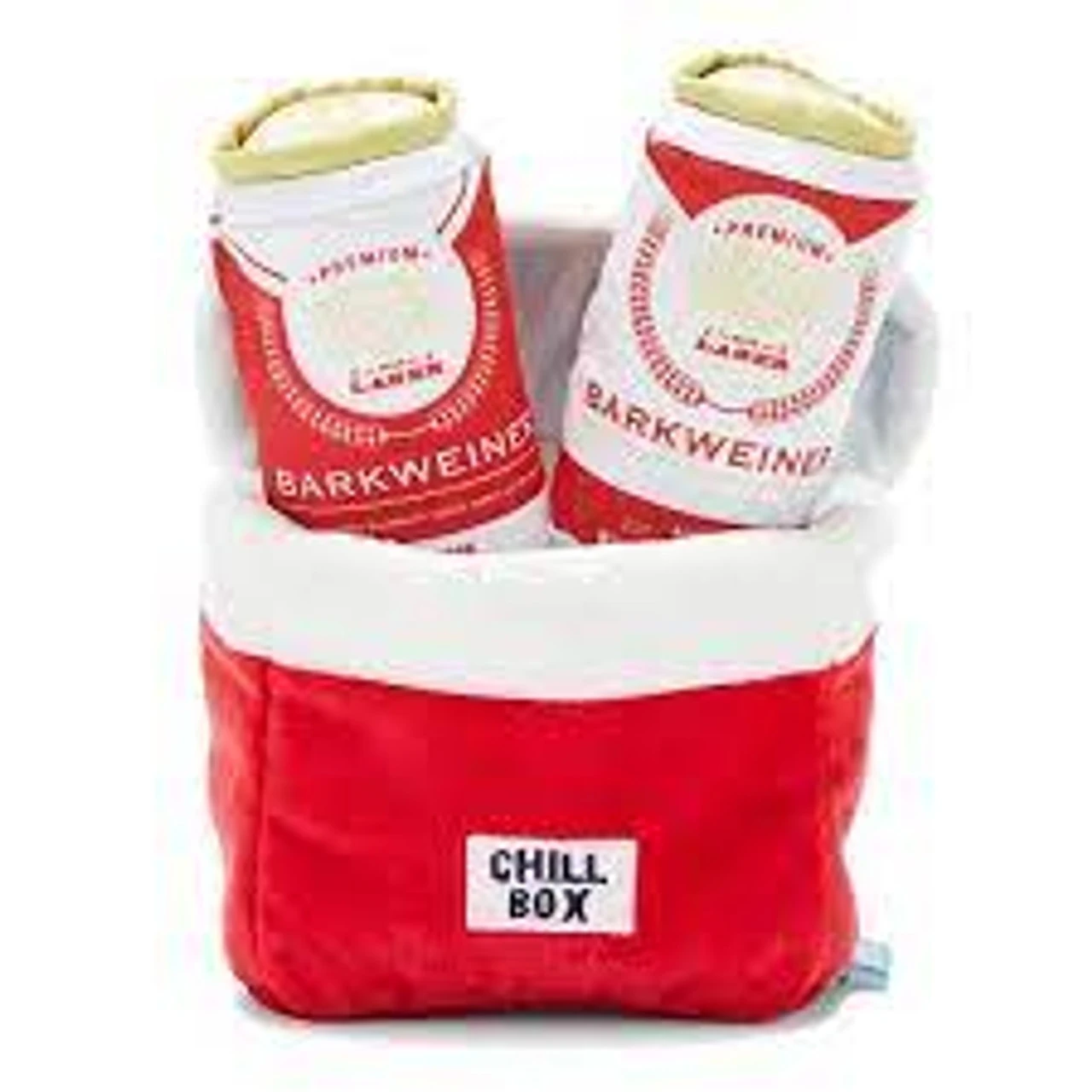 Play fetch with a cold drink in one hand and this Bite Lite Beer Cooler plush dog toy from bark in the other, perfect for summertime fun with your pup.