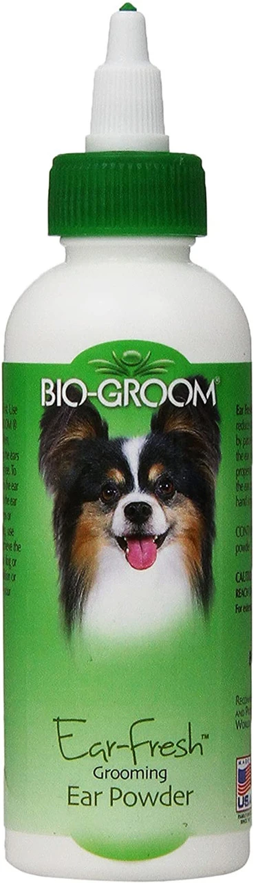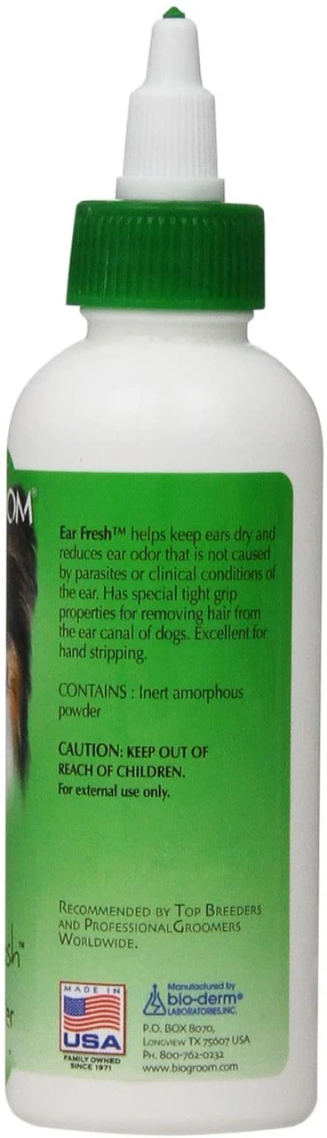 Help keep ears dry and reduce odor with this excellent ear powder. Ear Freshâ„¢ has special tight grip properties for removing hair from ear canals of dogs. Excellent for hand stripping. Comes with convenient funnel tip dispenser.