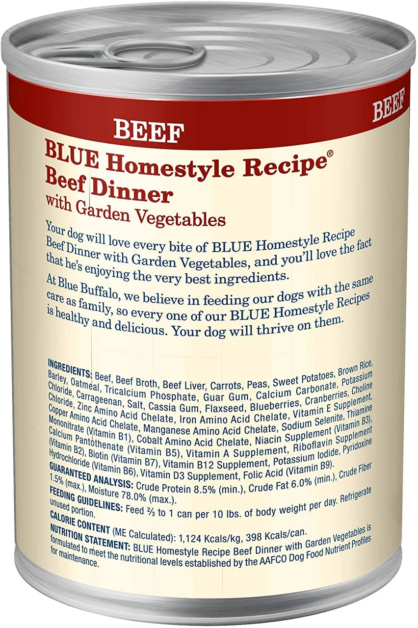 BLUE Homestyle Recipe Beef Dinner provides your dog with delicious, high-quality beef, wholesome whole grains and garden fruits and vegetables including carrots, sweet potatoes, blueberries and cranberries.
