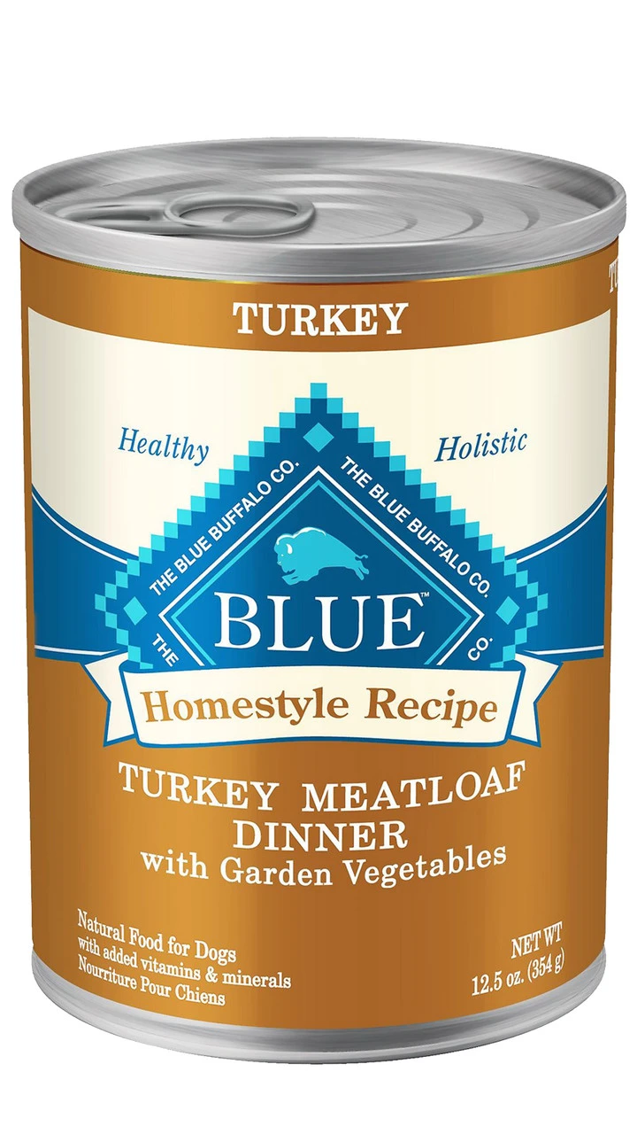 BLUE Homestyle Recipe Turkey Meatloaf Dinner provides your dog with delicious, high-quality turkey, wholesome whole grains and garden fruits and vegetables including carrots, sweet potatoes, blueberries and cranberries.