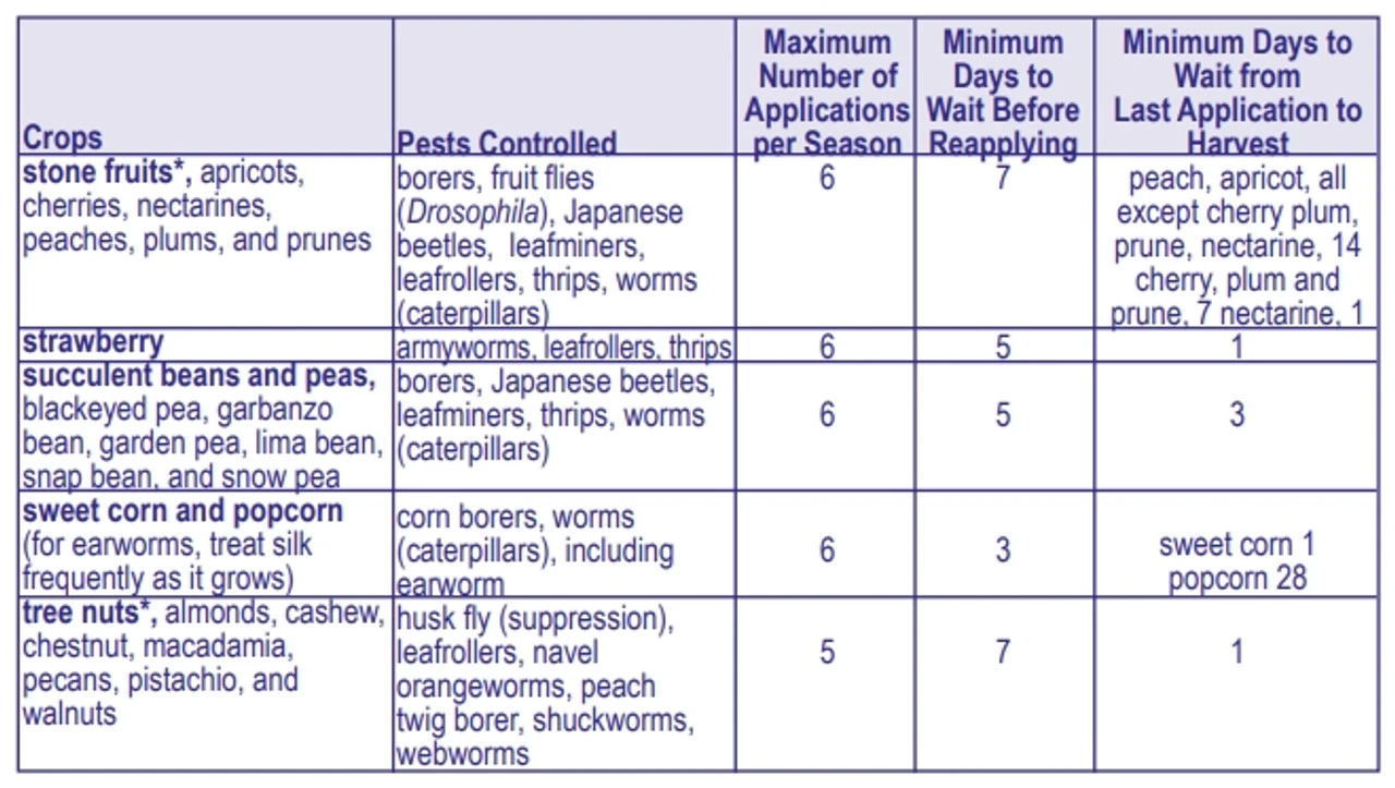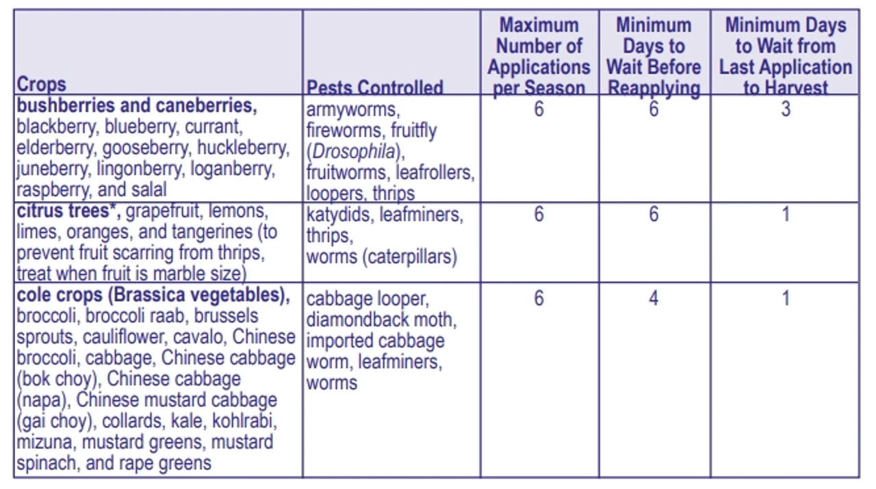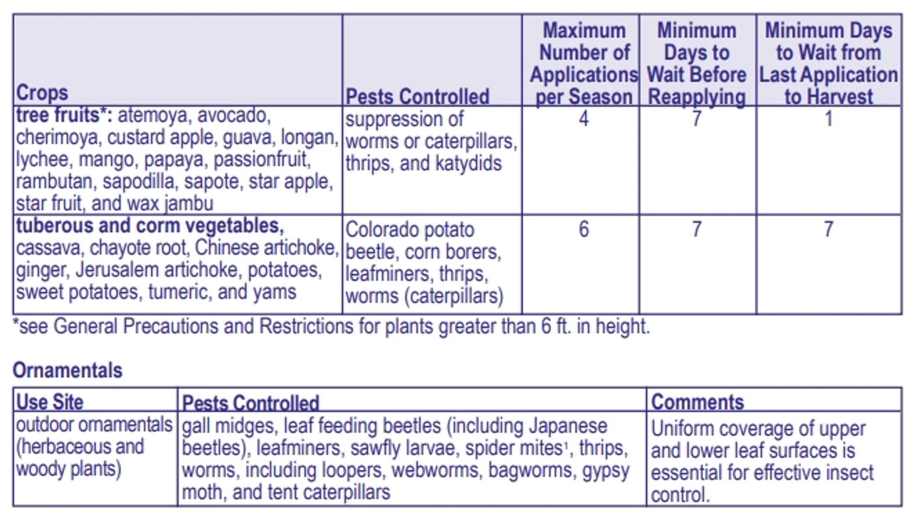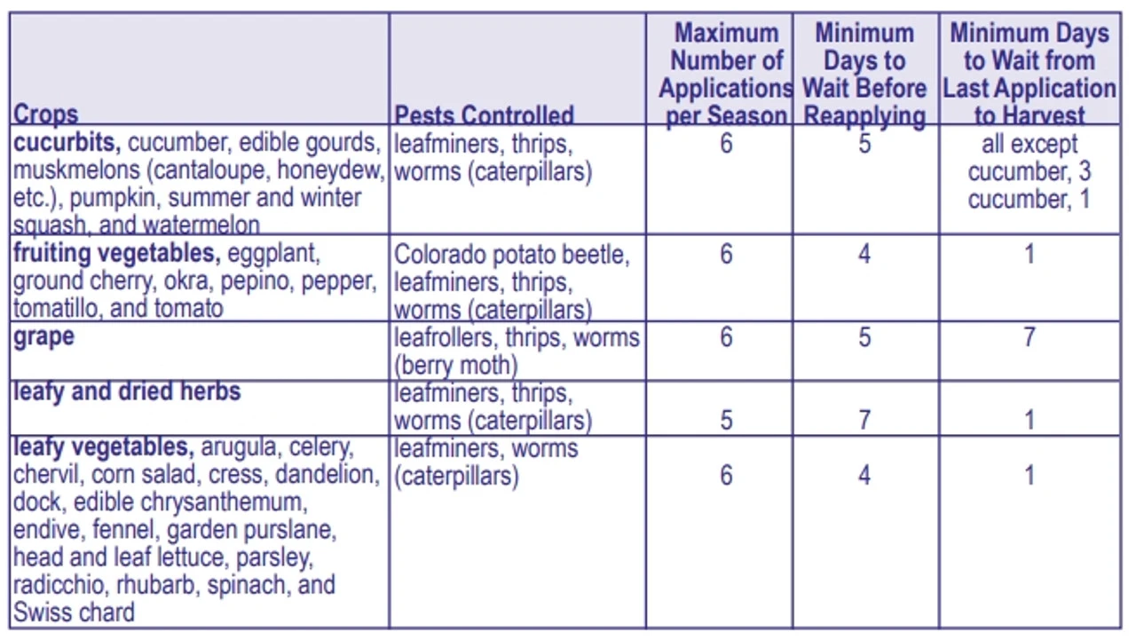 - VARIETY OF FOLIAGE – Protects a wide variety of plants including fruiting vegetables, cucurbits, cole crops, leafy vegetables, tuberous vegetables, stone fruits, bushberries, and pome fruits.