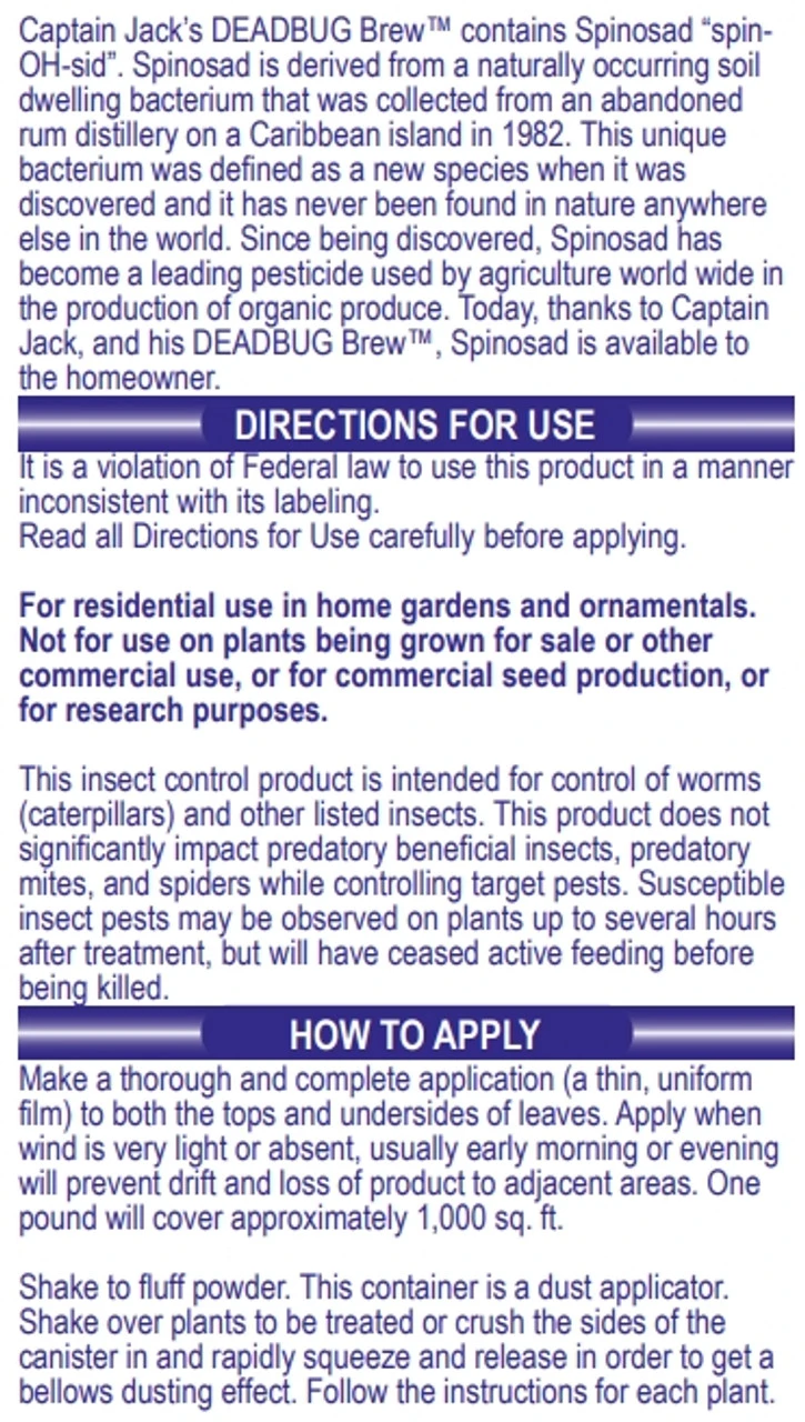 - ORGANIC GARDENING – The active ingredient in Deadbug Brew is a natural bacteria called Spinosad, which is a leading insecticide used worldwide. Approved for organic gardening.