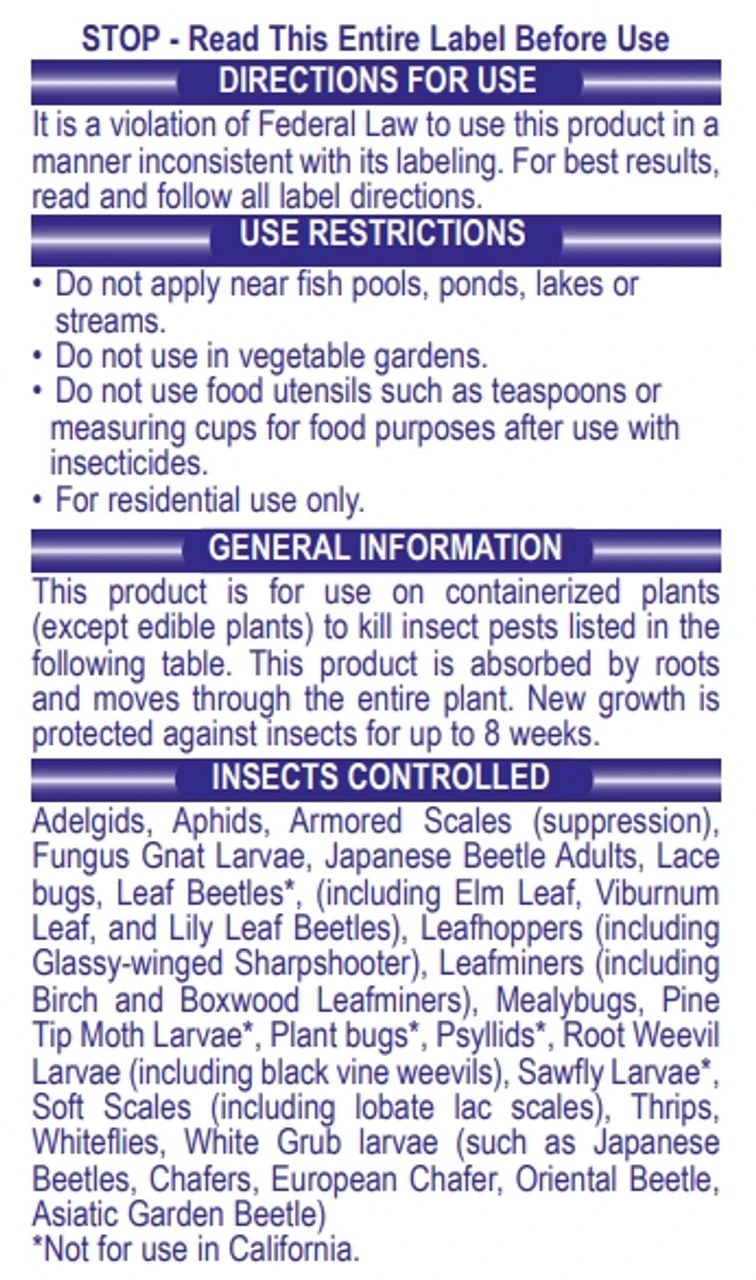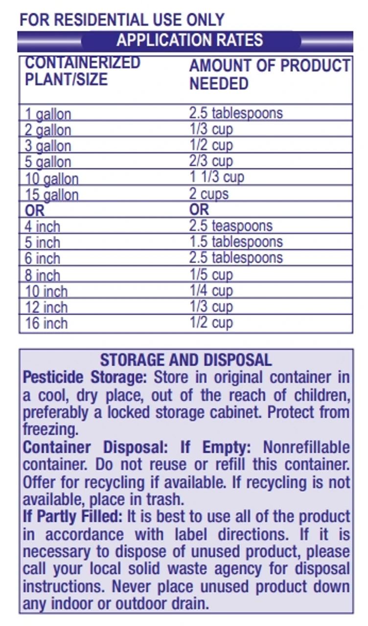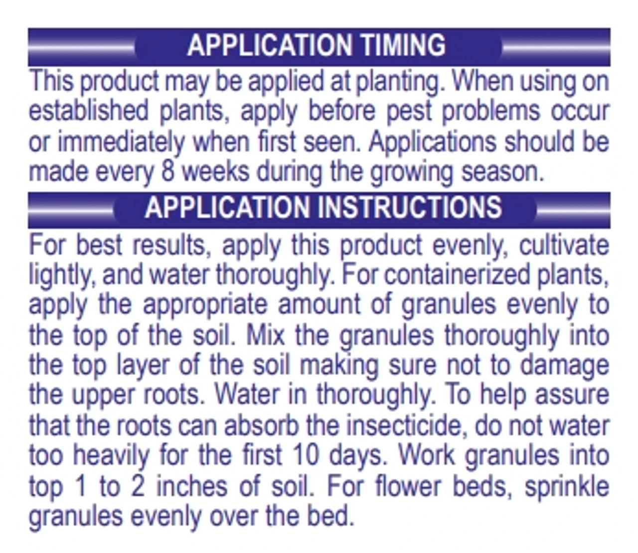 - NO SPRAYING…NO MESS – After incorporating the granules into the soil and watering them in, the insecticide is absorbed by the roots where it moves through the plants to kill listed insects through ingestion. Protection lasts for up to 8 weeks.