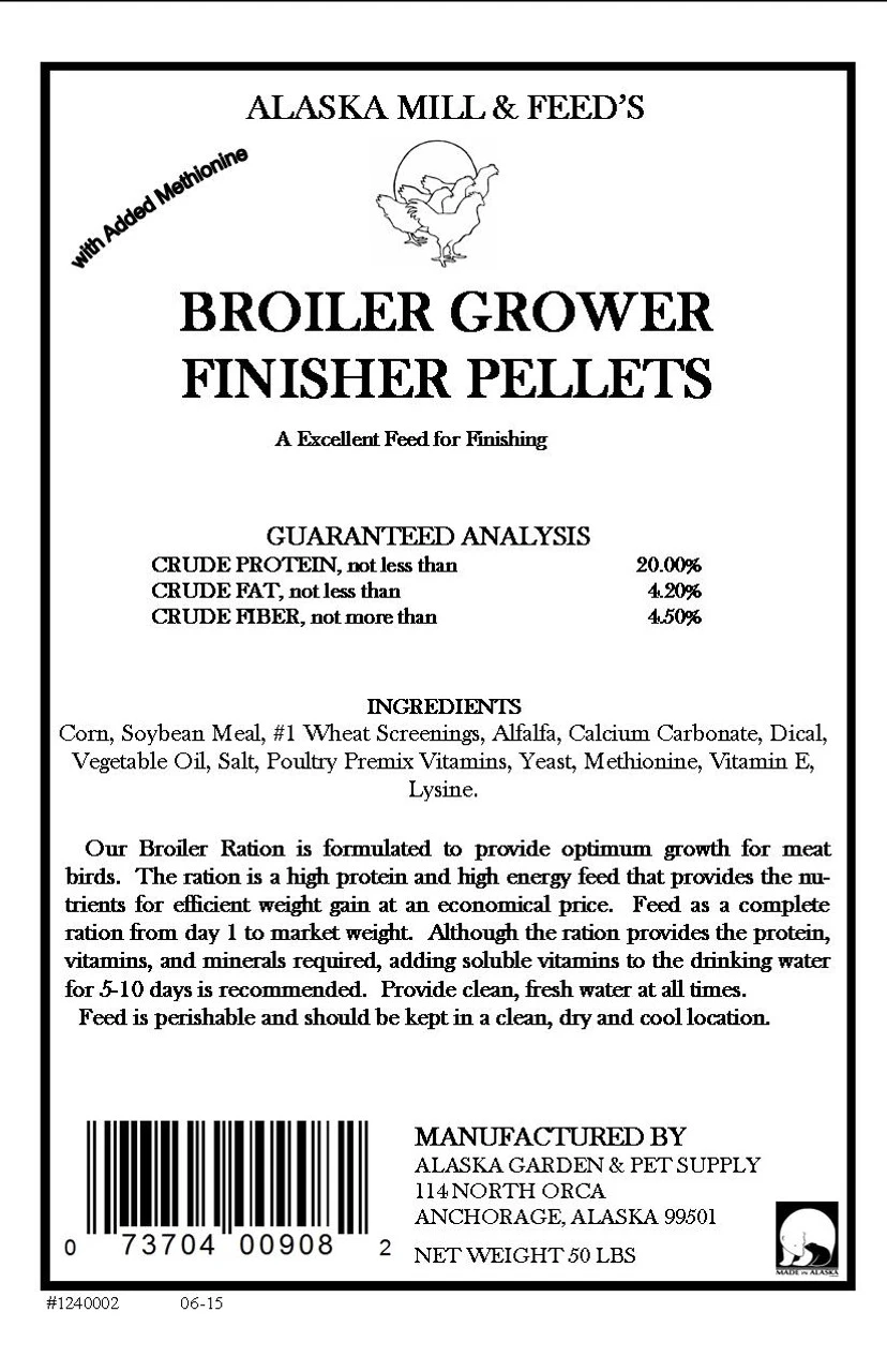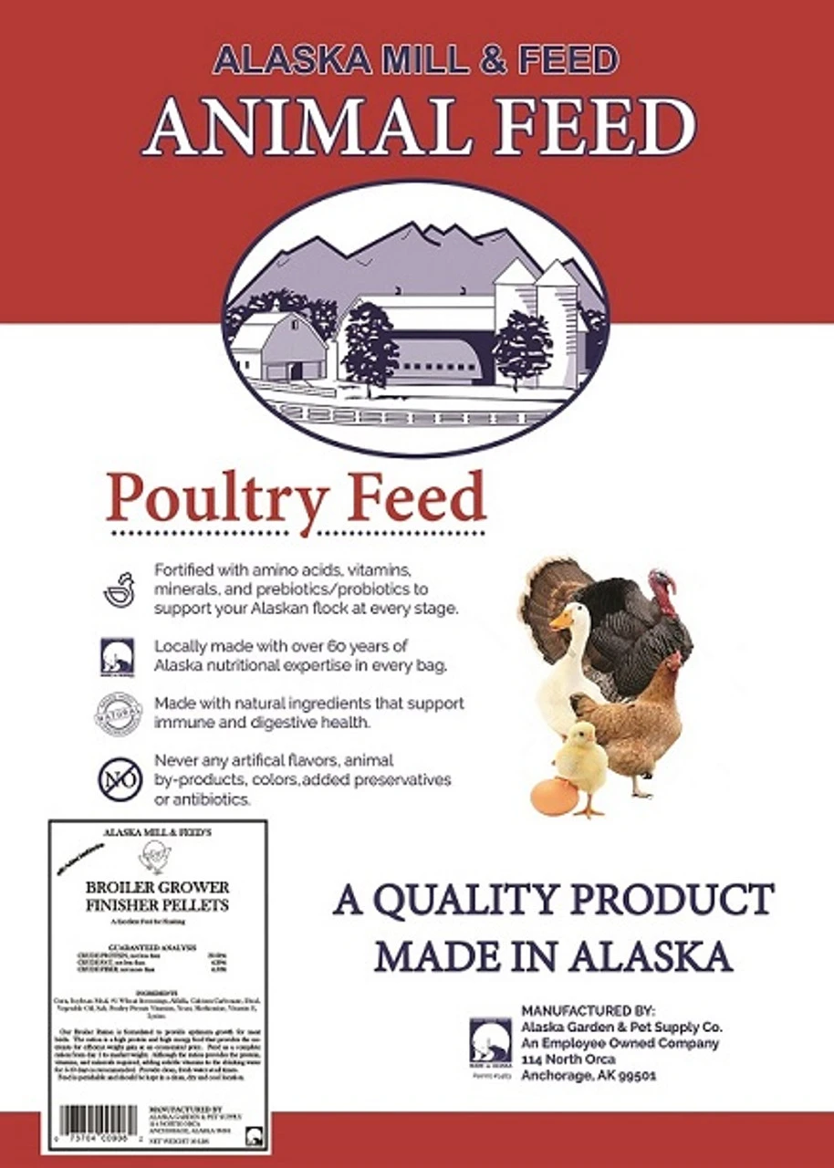 • Alaska made Broiler Grower Finisher Pellet fortified with Amino Acids, vitamins, minerals, prebiotics, and probiotics to provide optimum growth for meat birds