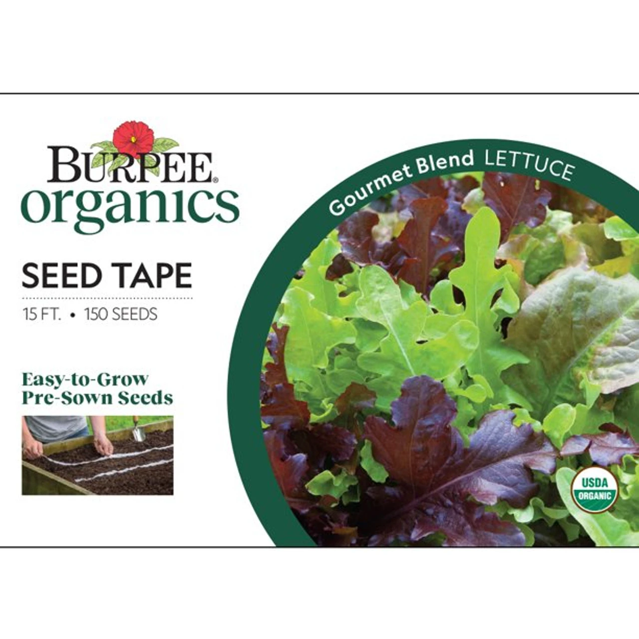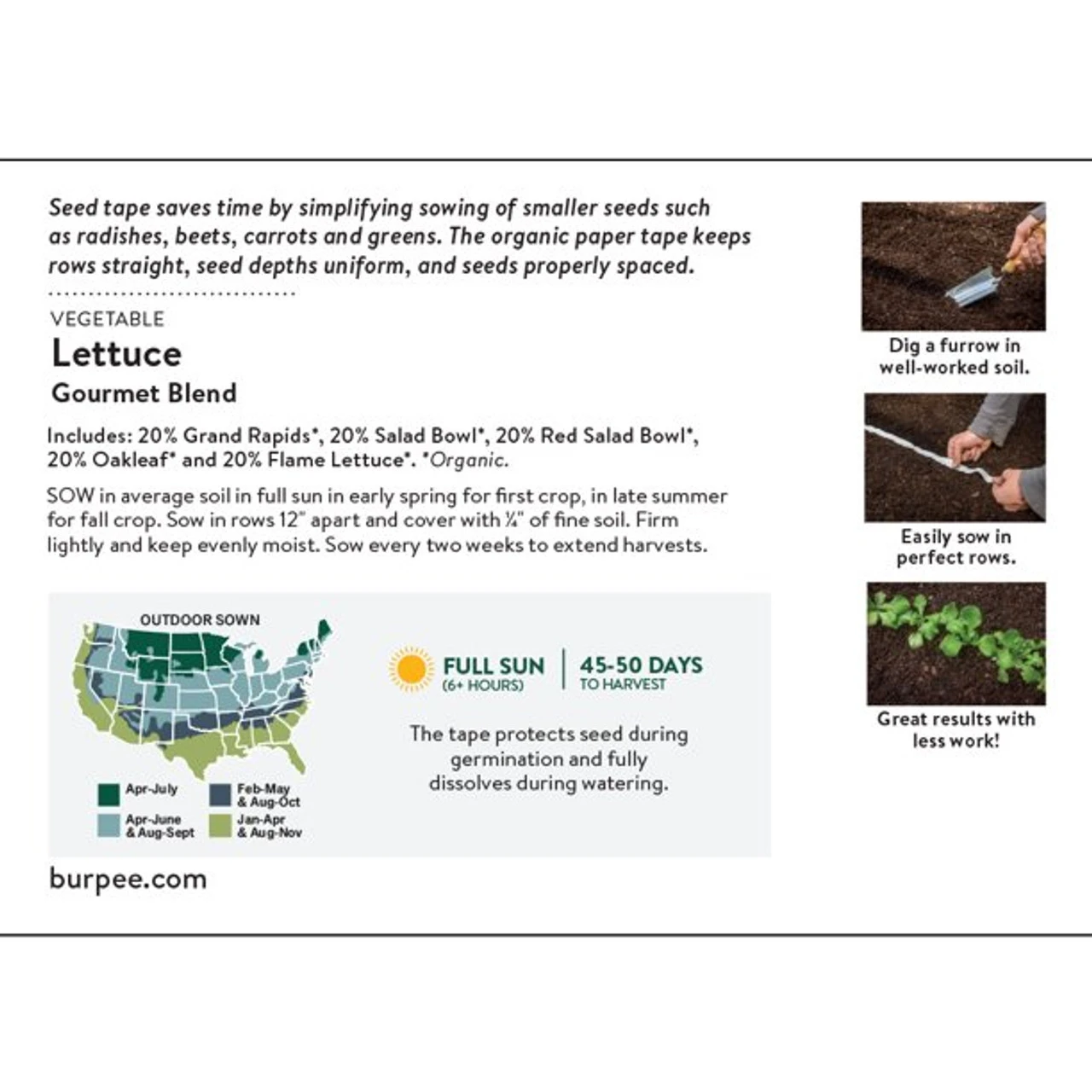 Our popular organic Gourmet Blend yields a long harvest of looseleaf lettuce. The tasty and colorful mix contains varieties in shades from green to red and textures from oakleaf to tightly ruffled. Fast-growing, tender, colorful and tolerant of hot weather. Lettuce grows best in cool weather and can be planted in early spring or grown as a fall crop. Organic paper seed tape keeps rows straight, seed depths uniform and seeds properly spaced. Best when picked minutes before your meal!