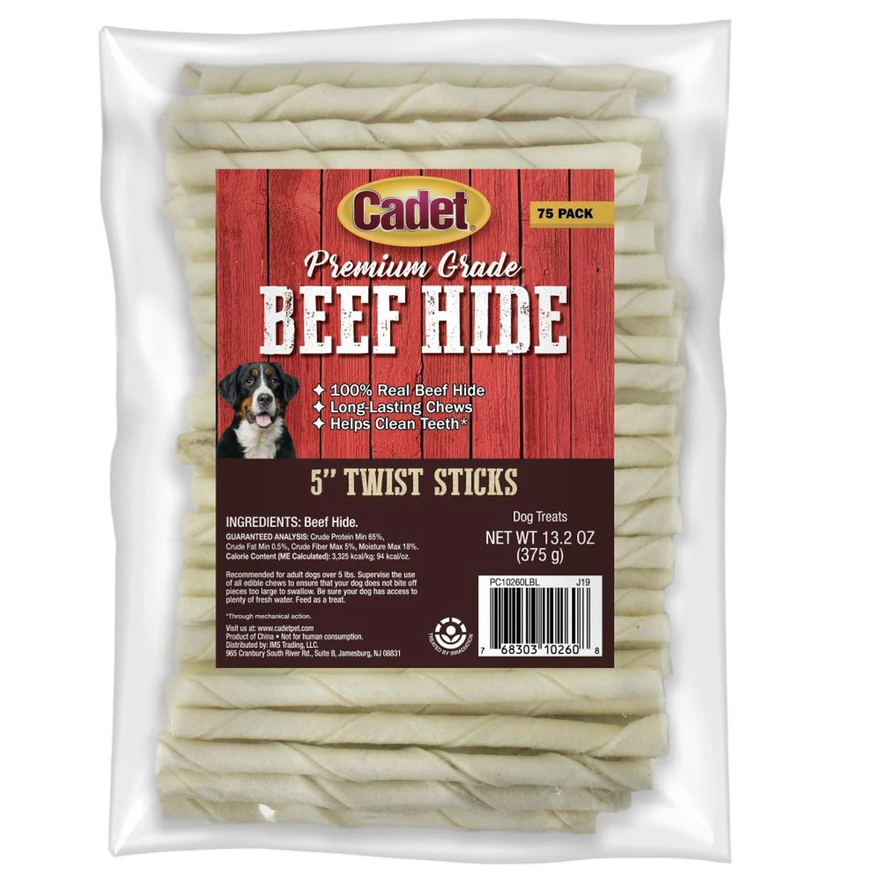 Cadet’s premium-quality Beef Hide Sticks are single-ingredient chews made of 100% real beef hide from the finest quality cattle. These natural rawhide twists provide entertainment for dogs who love to chew and promote healthy teeth and gums by reducing plaque and tartar buildup as dogs chew. Each irresistible dog chew will keep your best friend busy and happy!