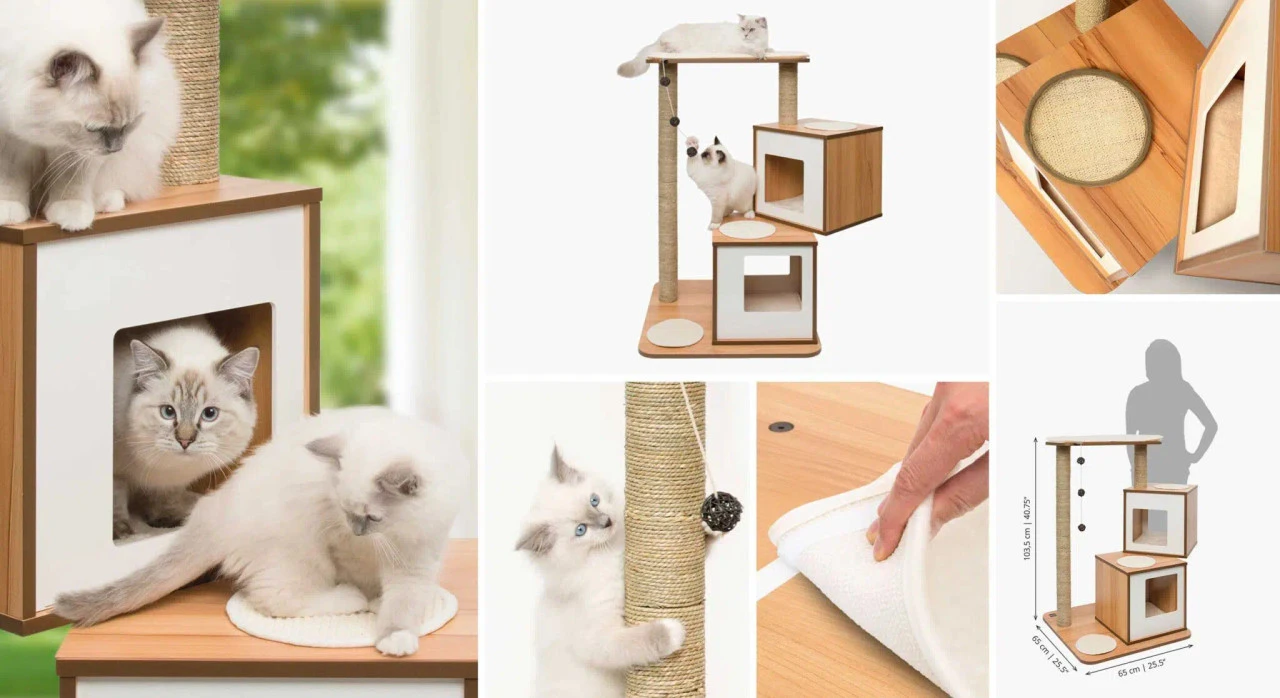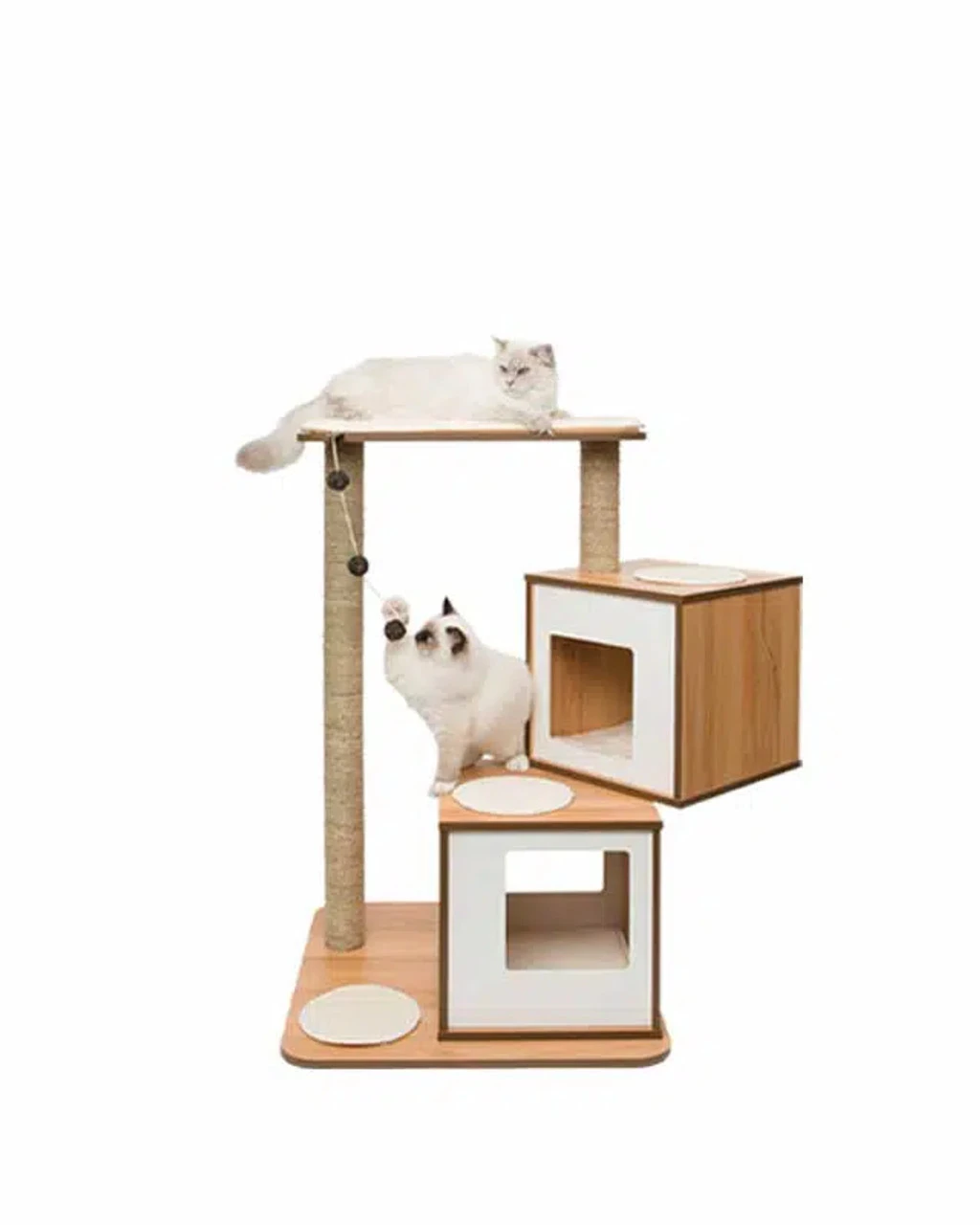 Named after its twin cubed dens, the Catit Vesper Double reaches 4 stories high at a height of 40.75 in (103,5 cm). The walnut-look laminate color adds a polished finishing touch.