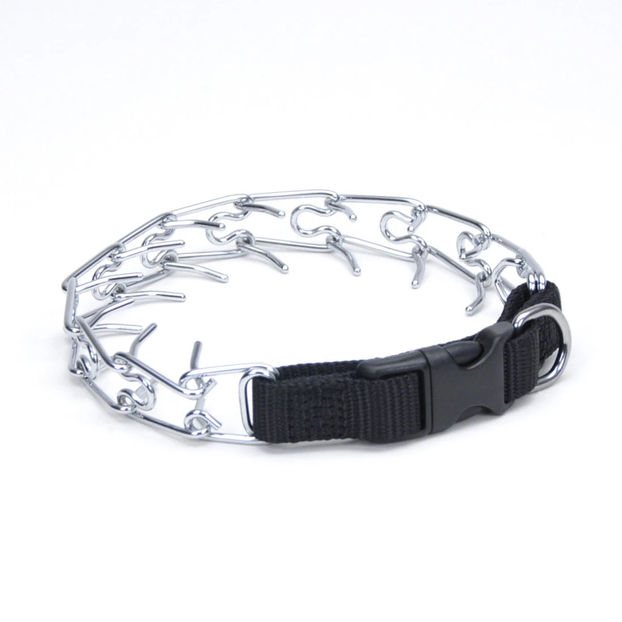 The Titan Easy-On Dog Prong Training Collar with Buckle is electric welded and chrome plated for maximum strength and durability. Featuring a convenient buckle for easy removal, it will not tarnish, rust or break. Extra links and vinyl comfort tips are available for this training collar. Available in 2.0 mm x 4″ 3.0 mm x 18″, 3.3 mm x 20″ and 4.0 mm x 22″. Chain training collars are safe, effective training tools with proper use. They are not to be used for tie out.