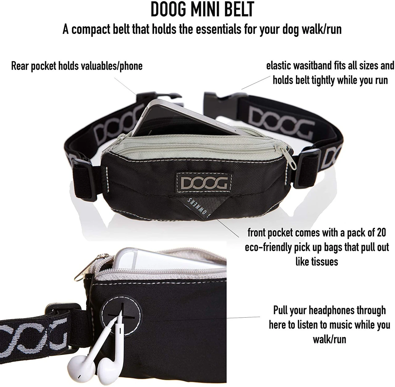 DOOG Mini Walking Belt for Active Dog Owners Includes 20 Waste Bags and Compartments for Phone, Keys, Money