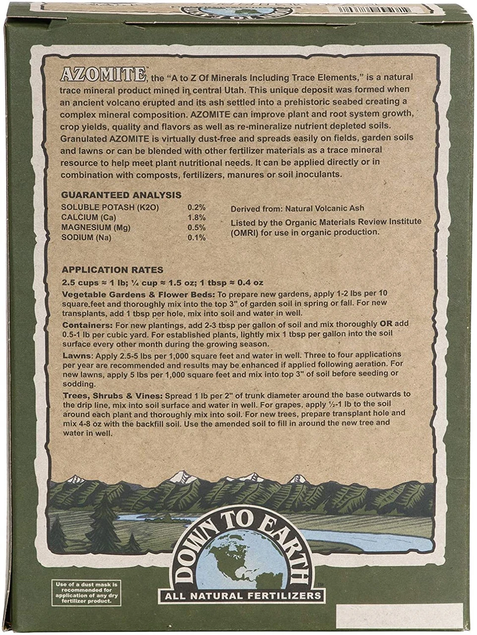 - Down To Earth Azomite is a five pound box of all natural granulated trace minerals with 0-0-0.2 formula and is listed by the Organic Materials Review Institute (OMRI) for use in organic production