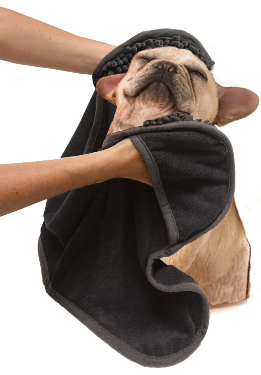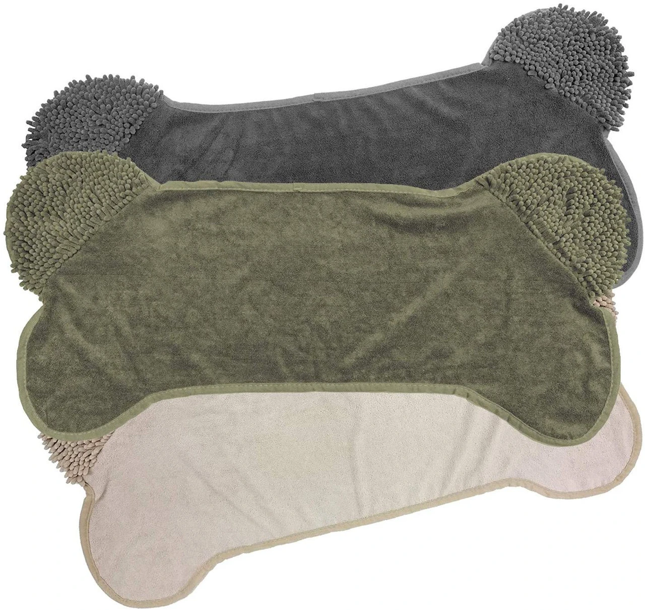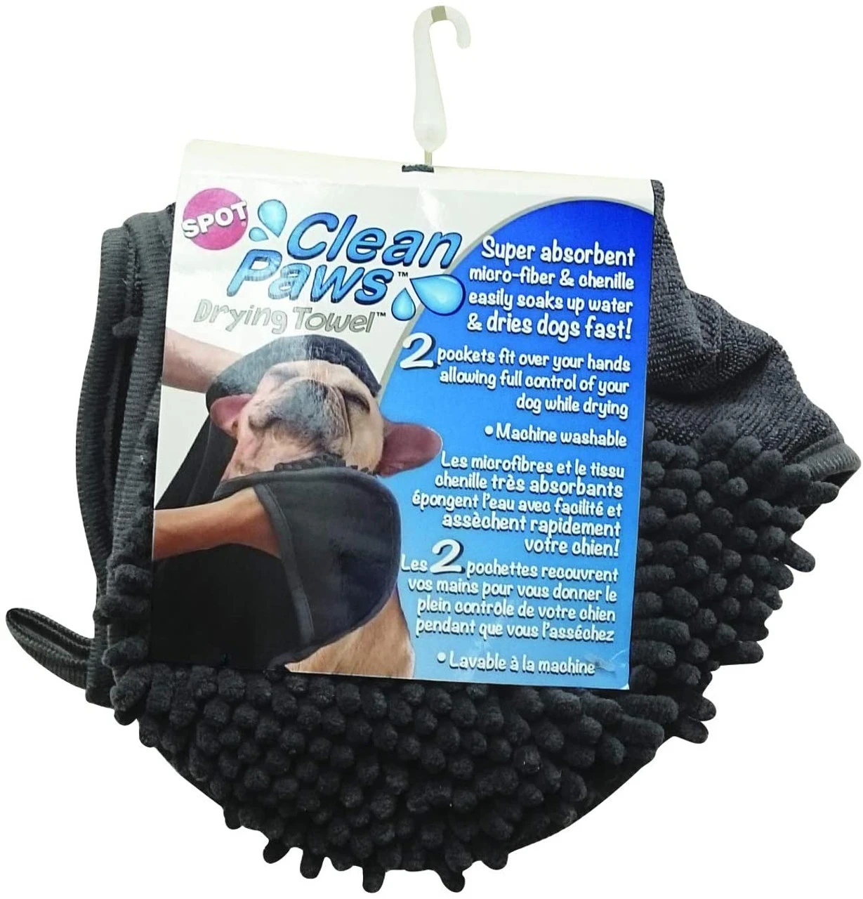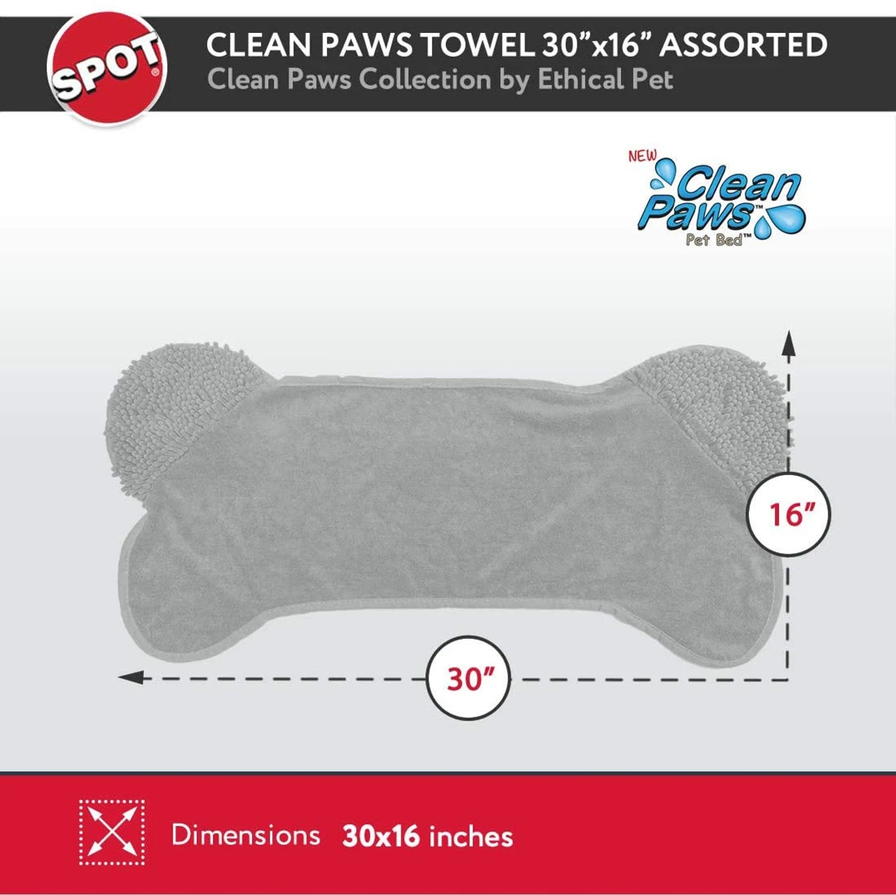 Clean Paws Towel is super absorbent micro fiber and chenille featuring corner hand pockets for a perfect fit. Soaks up water and dries dogs fast. Perfect for drying wet paws too. Machine washable. 30″ x 16″. Assorted colors.