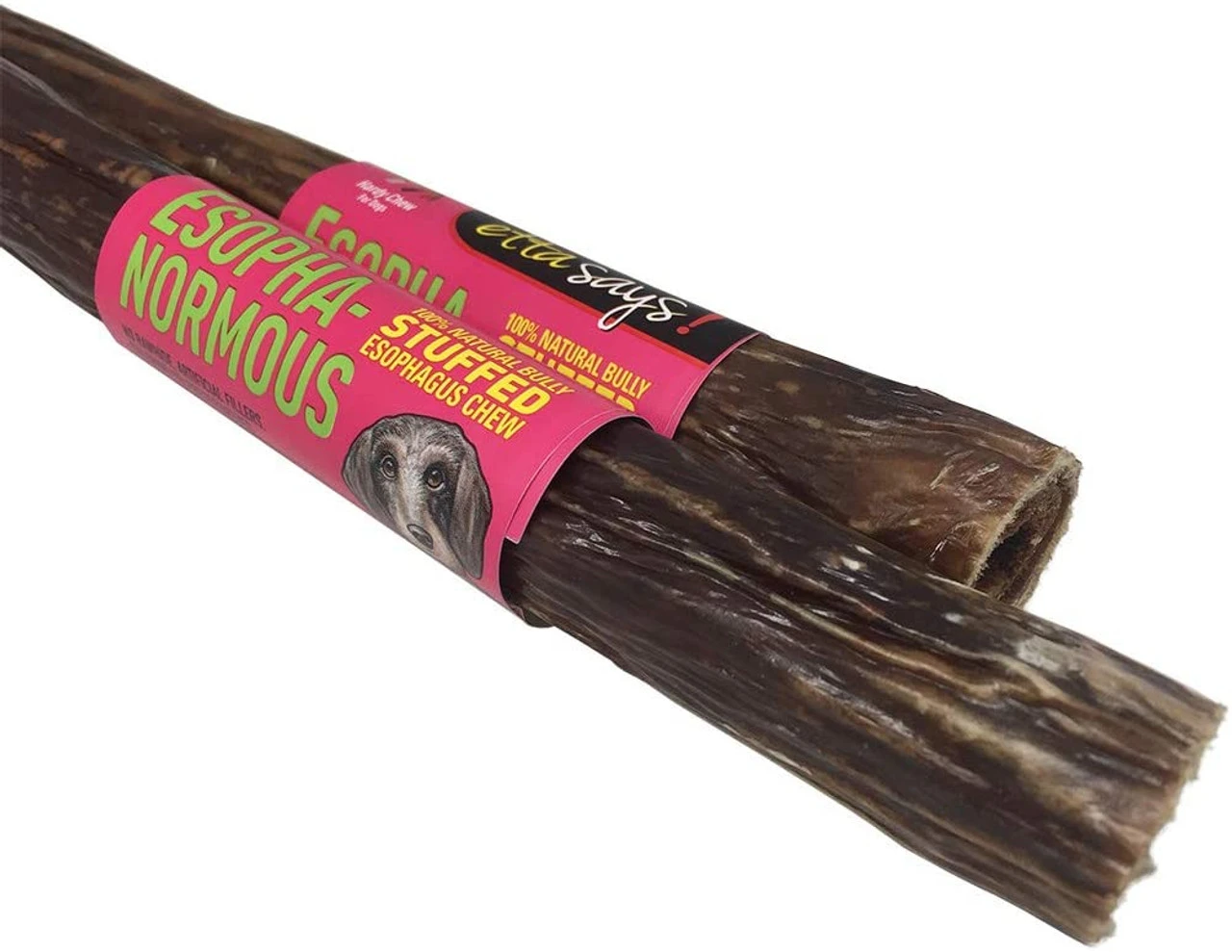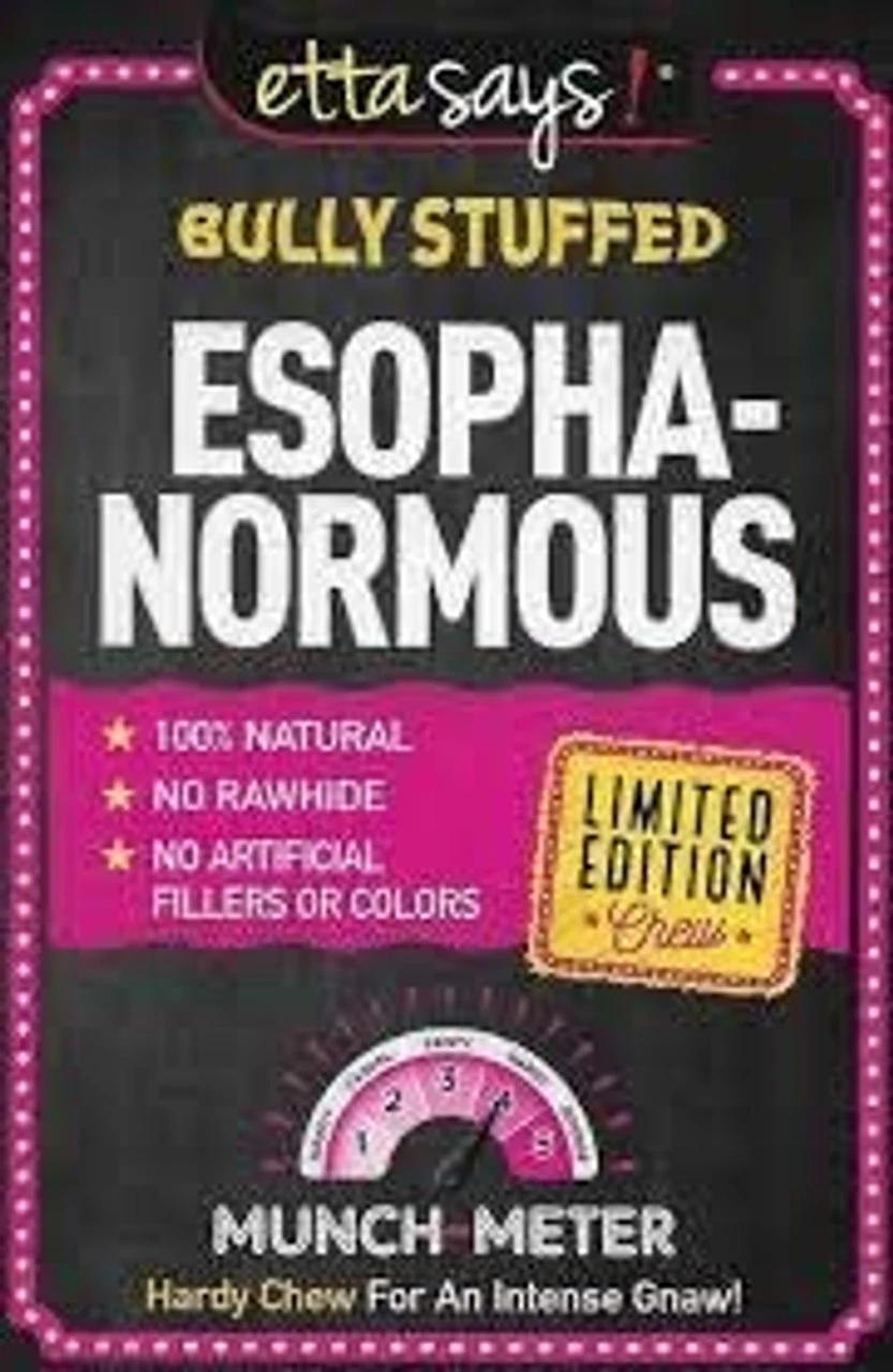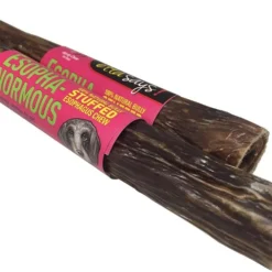 This dog chew is enormous – espophanormous! Your pooch will get hours and hours of long-lasting tasty chewing time from these natural bully esophagus chews from Etta Says! You’ll never have to worry about your pup running out of their chew again with this 30 inch treat! Made from all-natural USA-sourced esophagus filled with beef bully, tendon, and sweet potato. Easy to digest for sensitive tummies, making this limited-ingredient chew a great alternative to rawhide! No Artificial Additives. Made in USA.Â