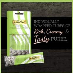 Fussie Cat Chicken with Vegetables Purée is love at first lick. Creamy in texture and rich in taste, this indulgent, flavorsome puree will make even the Fussiest of Cats demand more! Fussie Cat Chicken with Vegetables Purée is an easy-to-feed cat treat with essential vitamin E for your cat’s diet to support healthy skin and coat.
