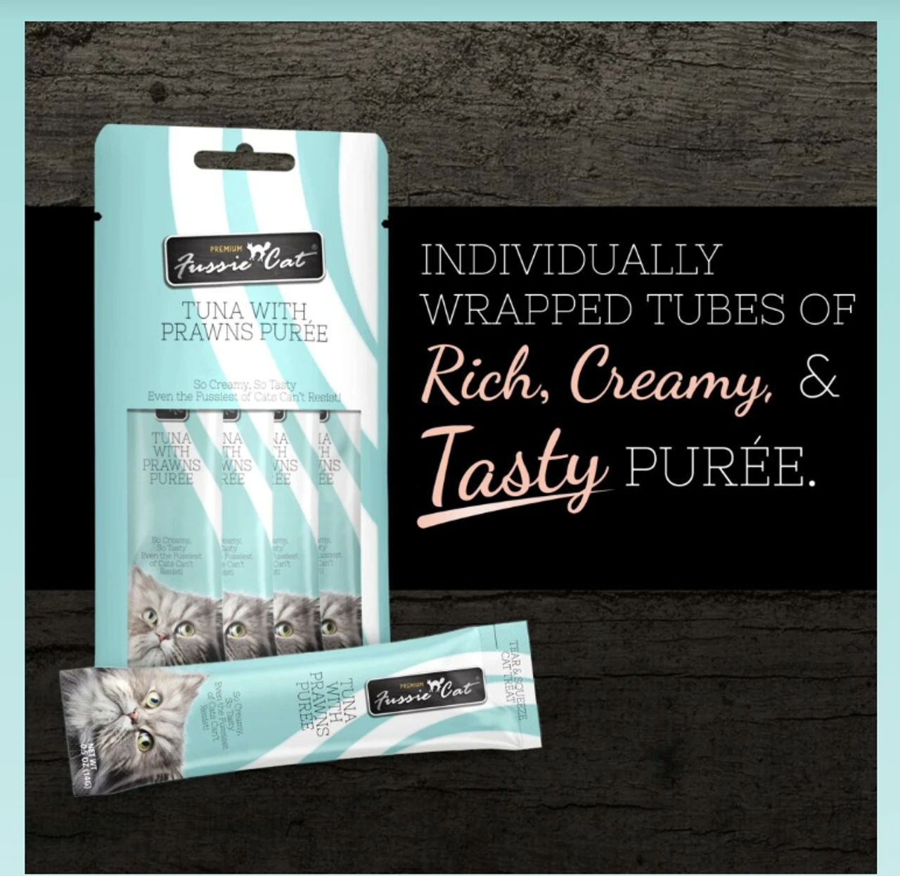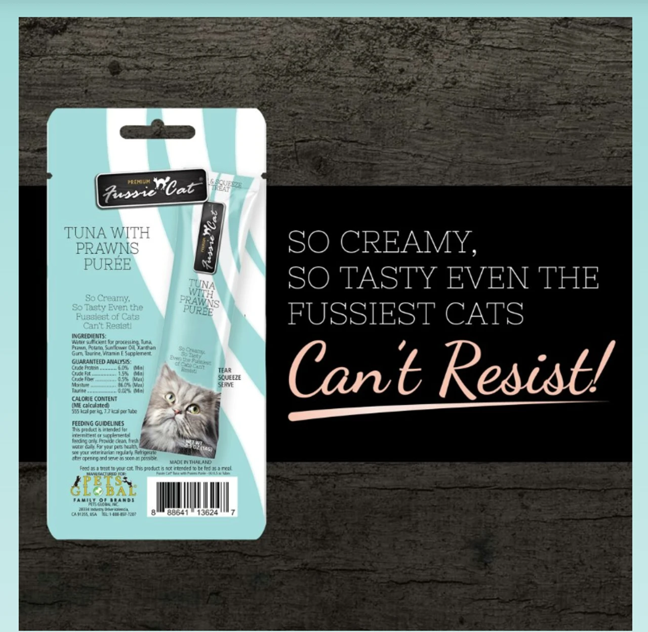 Fussie Cat Tuna with Prawns Purée is love at first lick. Creamy in texture and rich in taste, this indulgent, flavorsome puree will make even the Fussiest of Cats demand more! Fussie Cat Tuna with Prawns Purée is an easy-to-feed cat treat with essential vitamin E for your cat’s diet to support healthy skin and coat.