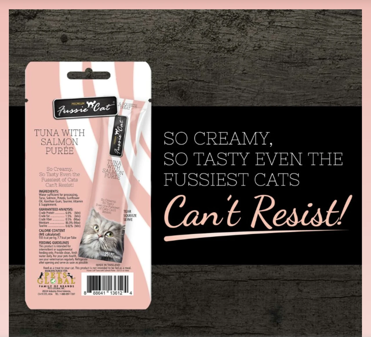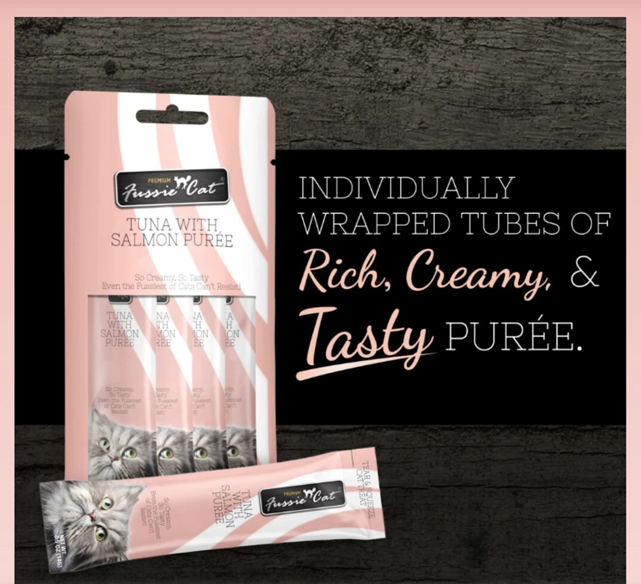 Fussie Cat Tuna with Salmon Purée is love at first lick. Creamy in texture and rich in taste, this indulgent, flavorsome puree will make even the Fussiest of Cats demand more! Fussie Cat Tuna with Salmon Purée is an easy-to-feed cat treat with essential vitamin E for your cat’s diet to support healthy skin and coat.