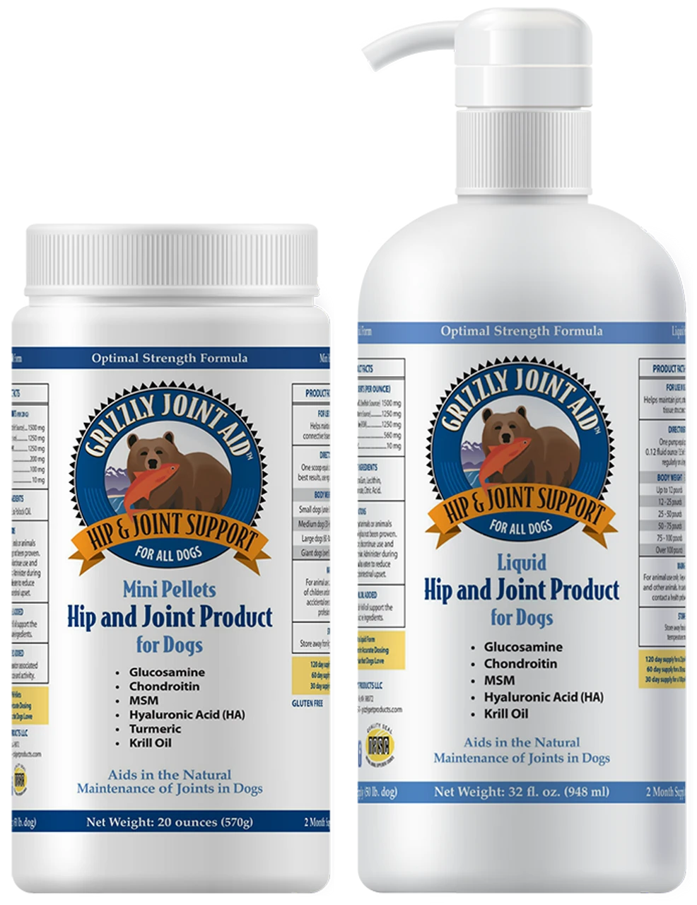 Grizzly Joint Aid comes in either liquid or mini pellet form, both with the same key active ingredients… choose the formula that’s easiest for you to use and/or the one that your pet prefers.