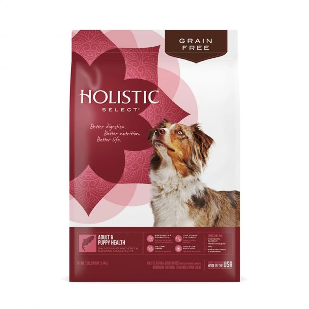 Holistic Select® grain-free dry dog food recipes are formulated with the digestive support & balanced nutrition your pet needs to live their best life. Grain-free, with optimal levels of protein plus prebiotics & probiotics, live yogurt cultures, digestive enzymes, and natural fiber these recipes enhance digestion and total body health. Holistic Select Grain Free Adult & Puppy Health Salmon and Anchovy & Sardine Meal Recipe is formulated to meet the nutritional levels established by the Association of American Feed Control Officials (AAFCO) Dog Food Nutrient Profiles for all life stages except for large size dogs (70 lbs or more as an adult).