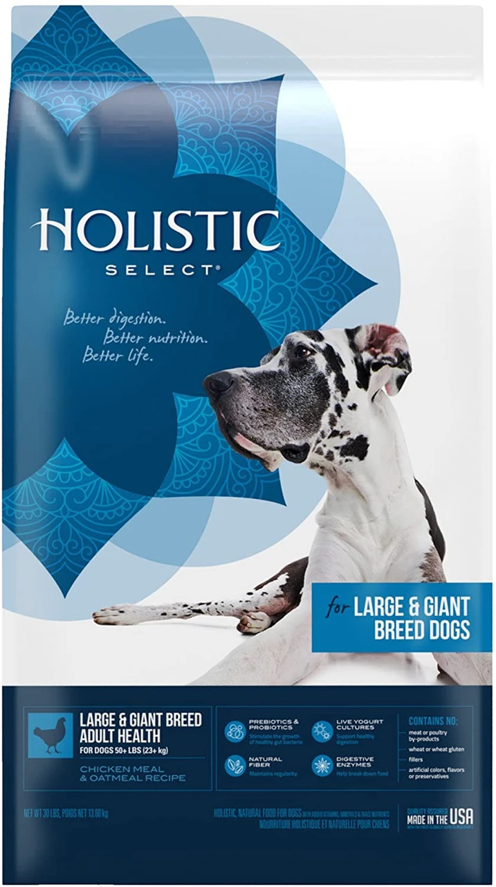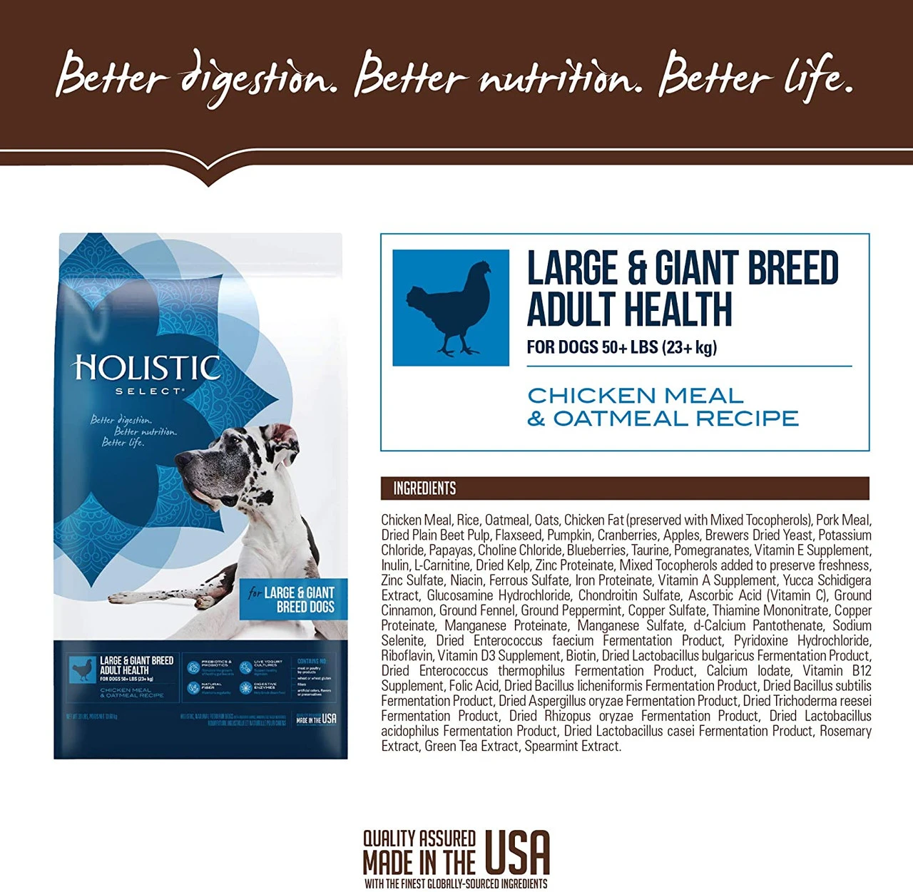 Holistic Select Natural Dry Dog Food Large & Giant Breed Chicken Meal & Oatmeal Recipe is specially formulated natural dry dog food for large breed dogs with larger kibble for larger mouths and our unique Digestive Health Support System, including active probiotics, healthy fiber and digestive enzymes. When combined with our other high quality, natural ingredients, this recipe supports the absorption and utilization of vital nutrients throughout your dog’s entire body. Your dog will look and feel healthy from the inside out. Antioxidant-rich superfoods: Supply natural antioxidants that support cellular health. Natural ingredients: Increase variety of good bacteria in the gut to enhance digestion & promote regularity. Optimal levels of calcium & phosphorus maintain bone strength.