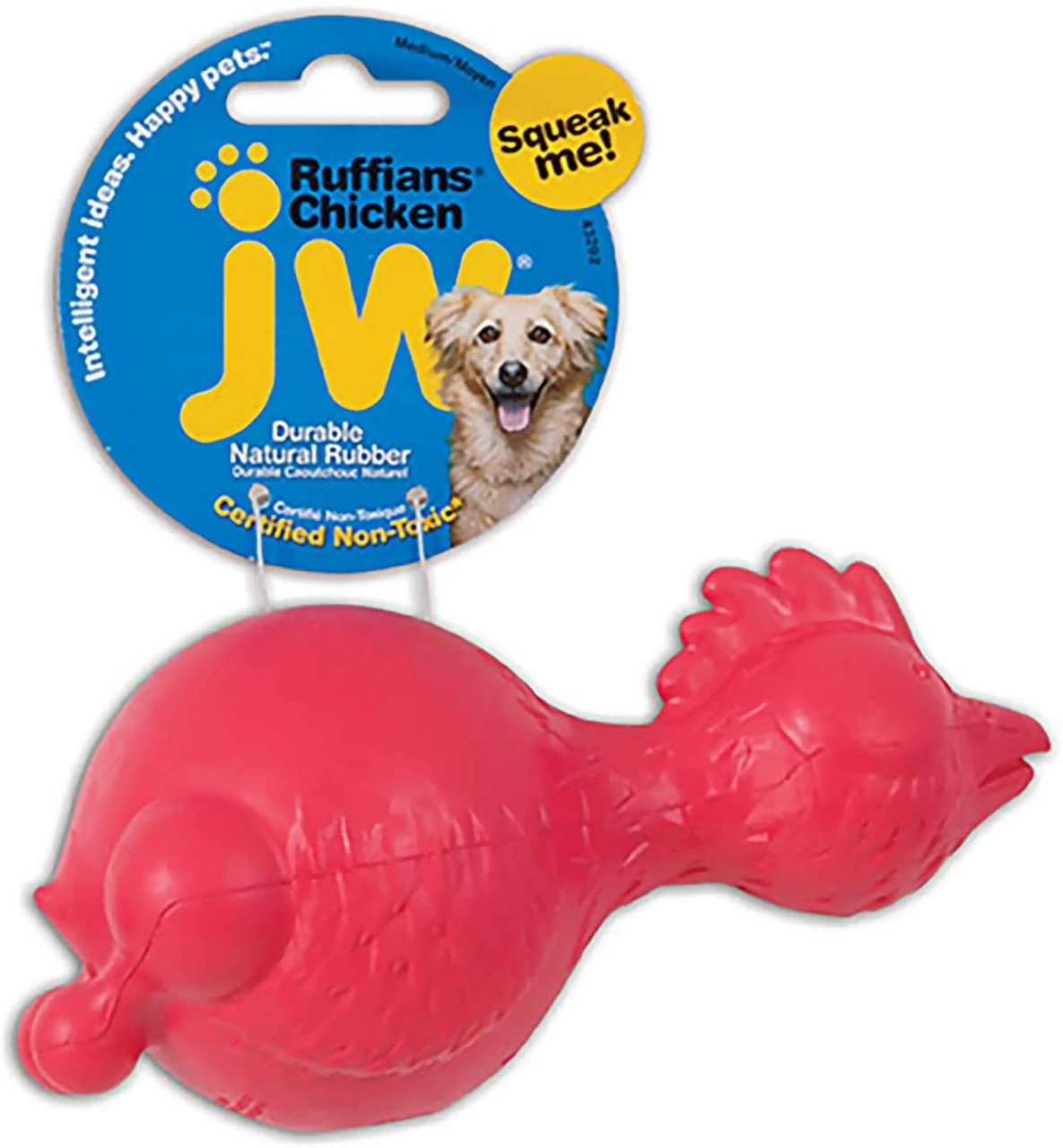 Bowl your dog over with this durable, squeaky, crazy bouncing JW® Ruffians cat dog toy. Unique weighting and shape make for unexpected rolling patterns and funny flying habits. Great for fetch or solo play. Durable rubber stands up to chewing. Easy to pick up, throw, and carry around. The squeaker is designed to fall inside the toy to prevent a choking hazard.