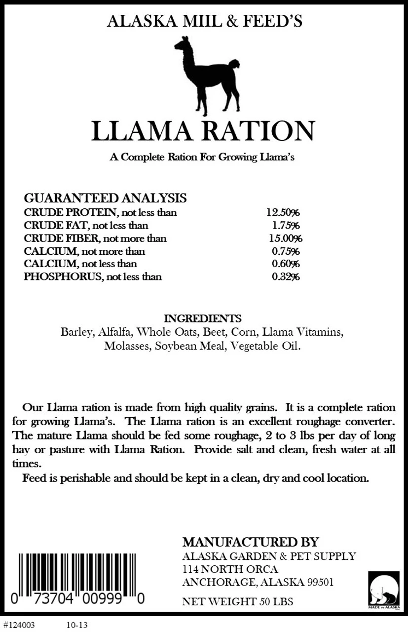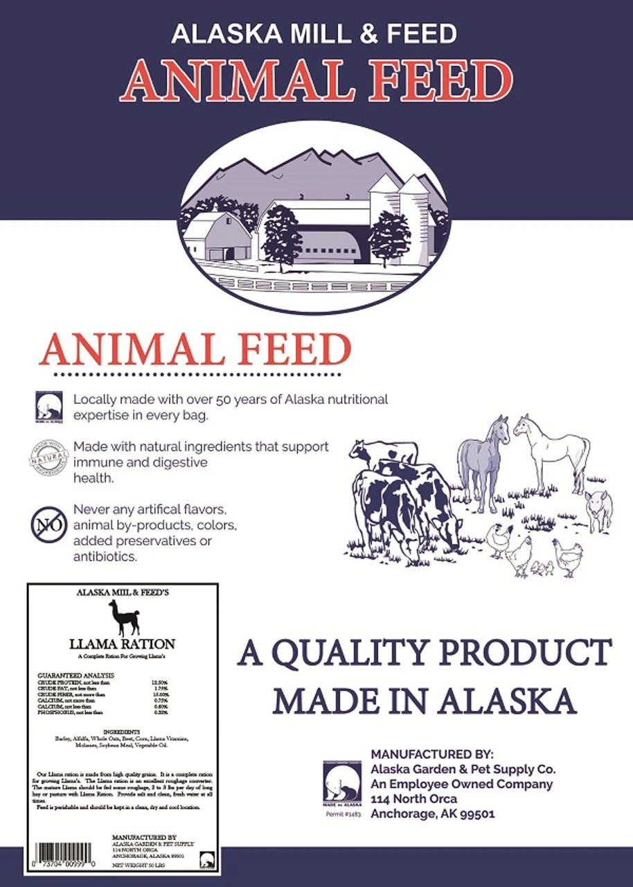 • Complete Alaska made llama ration made from high quality grains with necessary vitamins and minerals that growing llama’s need