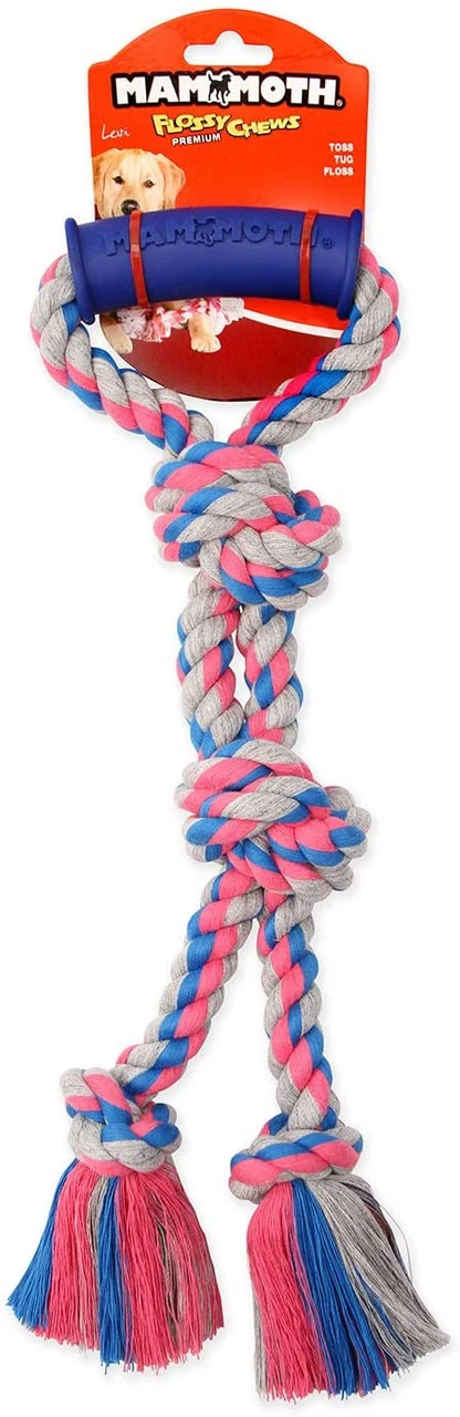 Mammoth Flossy Chews Twin Tug With Rubber Handle Dog Toy are interactive toys that satisfy playing requirements. Rope blend helps dogs maintain good dental hygiene. Tug, toss and floss while playing.