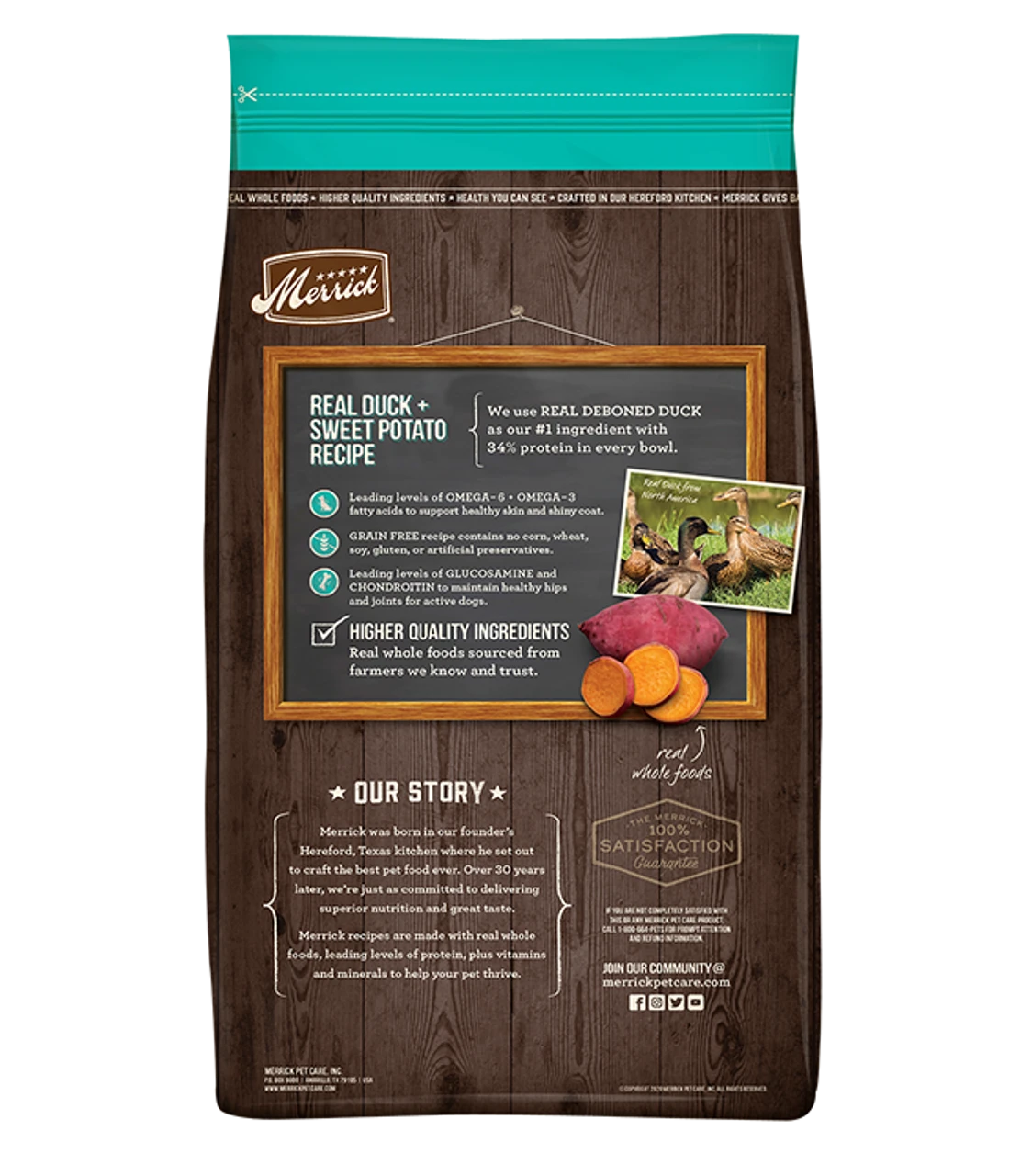 Merrick Grain Free Real Duck + Sweet Potato Recipe Dry Dog Food provides balanced nutrition with real whole foods sourced from local farmers we know and trust. This natural, grain free formula dog food is ideal for all breeds and sizes of dogs with a focus on naturally nutrient rich ingredients to support overall health.