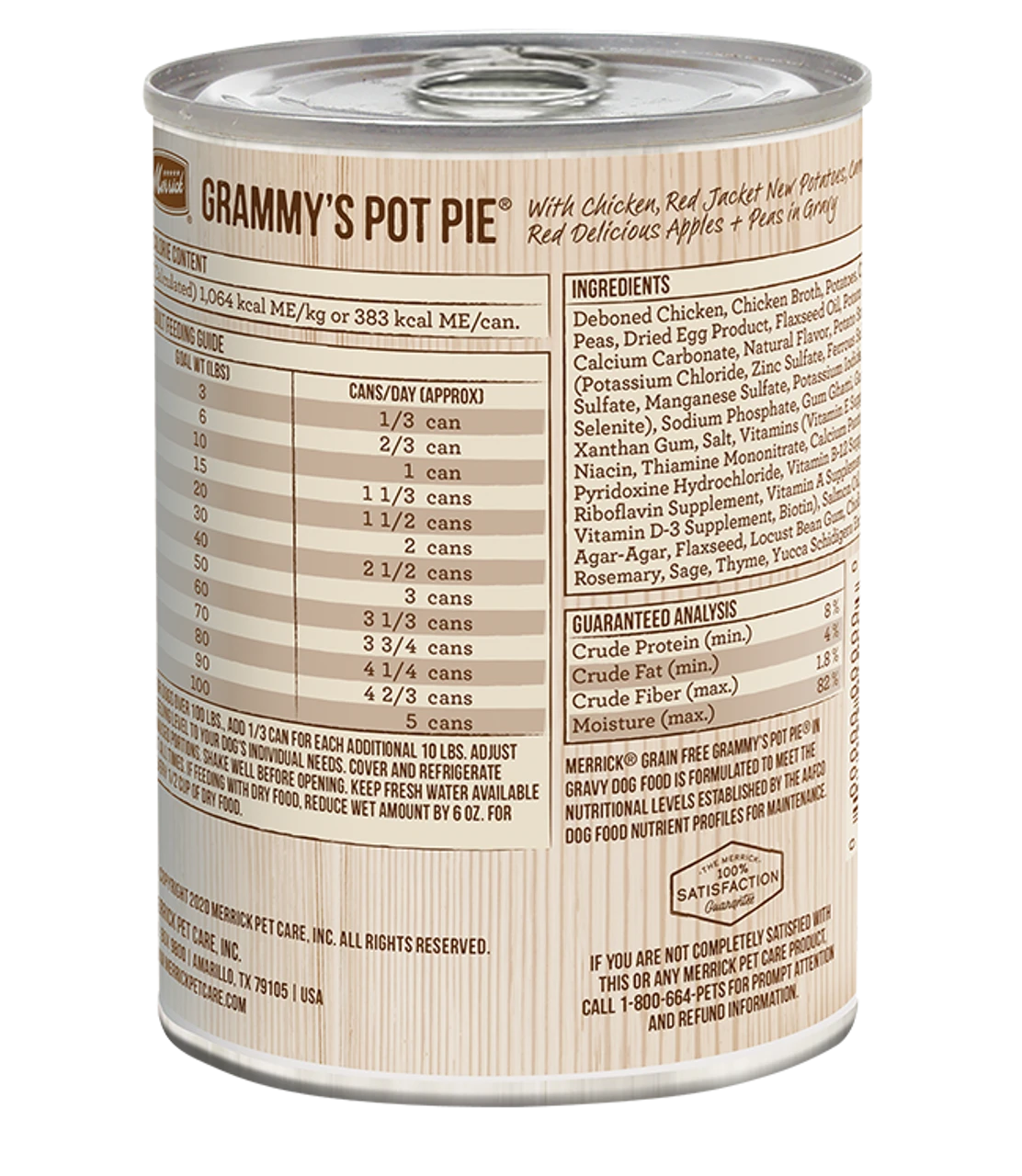 Merrick® Grain Free Grammy’s Pot Pie® in Gravy Dog Food is formulated to meet the nutritional levels established by the AAFCO Dog Food Nutrient Profiles for maintenance.