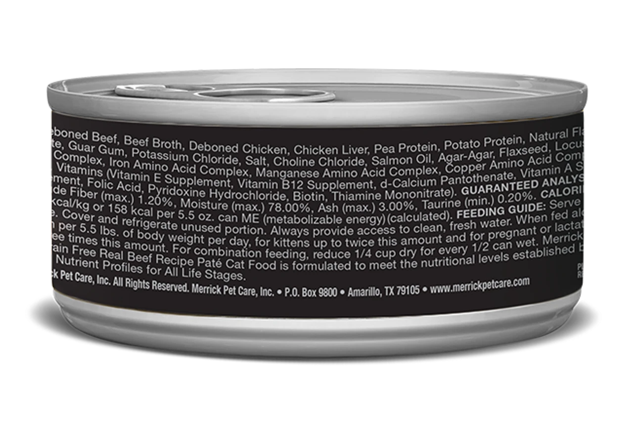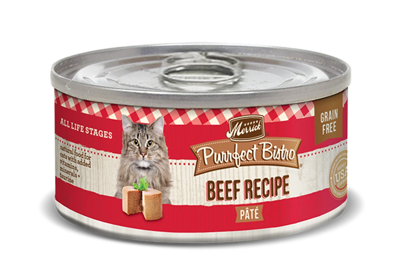 Merrick (R) Purrfect Bistro Grain Free Beef Recipe Pâté Cat Food is formulated to meet the nutritional levels established by the AAFCO Cat Food Nutrient Profiles for All Life Stages.
