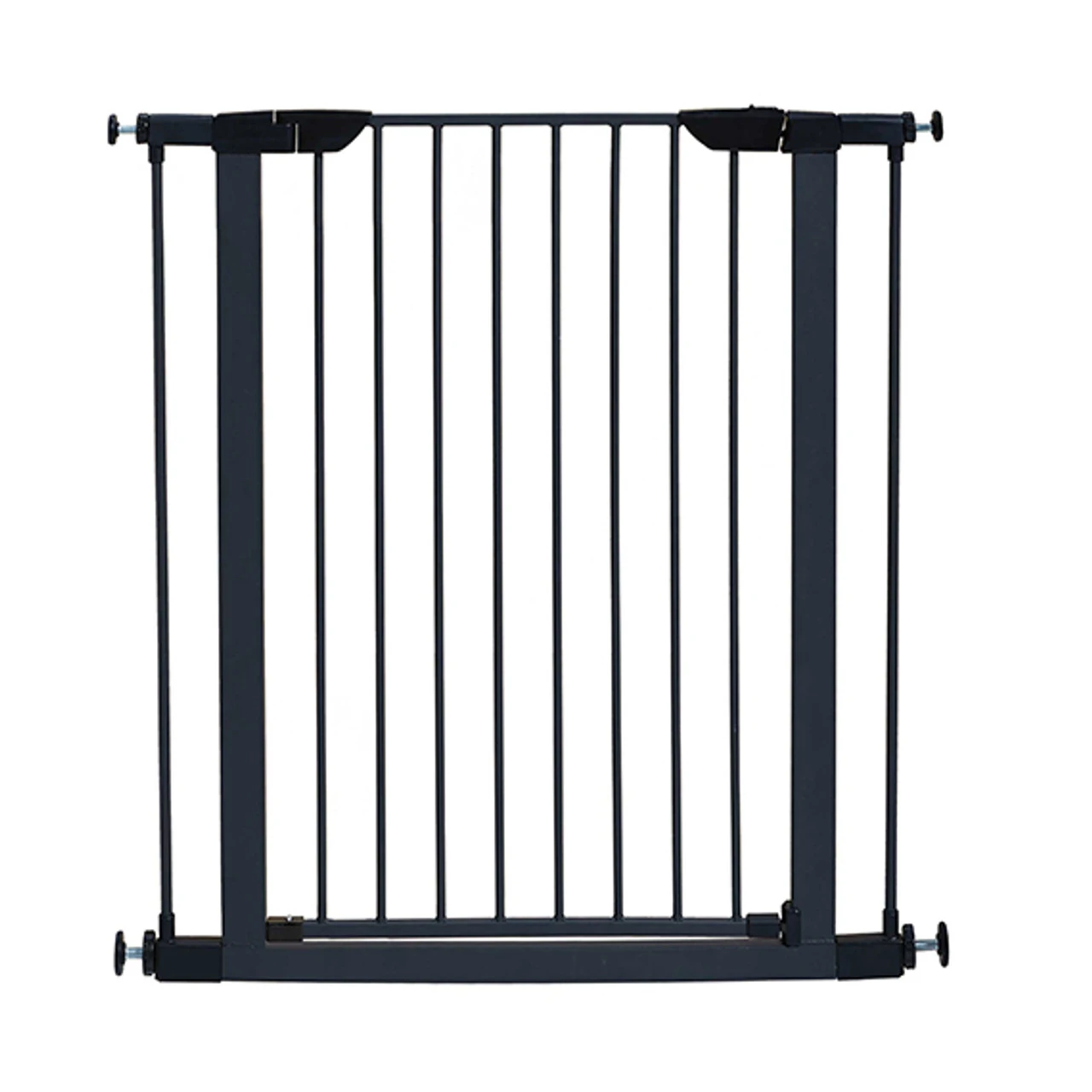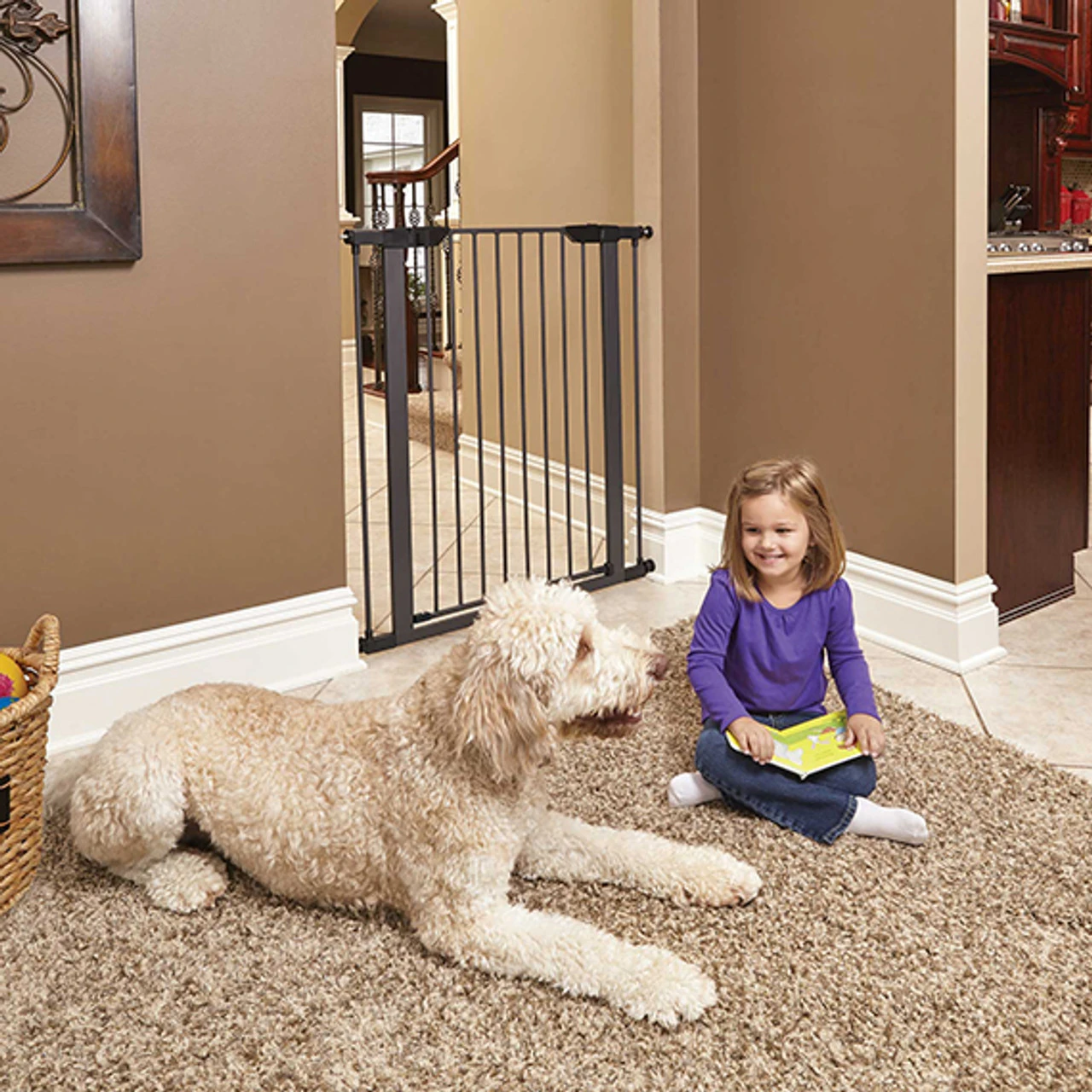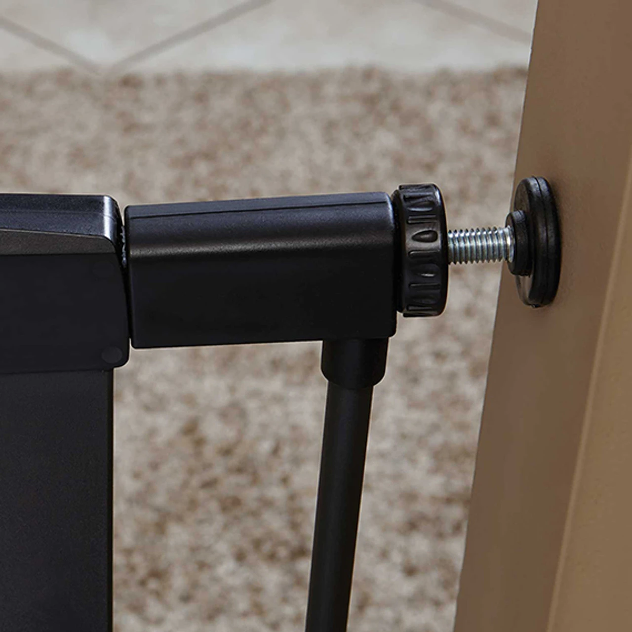 Steel Pet Gates by MidWest Homes for Pets offer a sturdy, attractive, and convenient way to keep your pet in a good place. This portable gate can be expanded to fit wide spaces from 29.5 to 38 inches. Additional extensions can be purchased separately to fit an entryway with a maximum width of 54 inches. The one-handed, safe and secure spring-loaded latch allows you to easily operate the 19” wide door, which swings in both directions for ultimate convenience. Assembly is simple. Tools are not required unless using the optional mounting cups, for which a Phillips screwdriver is needed.