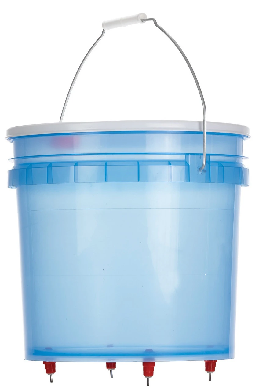This gravity-feed Hen Hydrator provides access to clean water on demand. The translucent bucket was designed to provide UV protection to prevent algae growth and allow for easy viewing of the water level. Lid fits tightly to prevent spills and protects contents while easy-to-remove fill plug allows for refilling without having to remove the entire lid. Each of the 4 nipples can accommodate up to 4 birds. Hanging height will vary by breed but should be high enough so that chickens must reach up slightly to drink. This waterer is recommended for adult birds only and is not recommend for use in freezing weather. For best results remove all other water sources, and tap each nipple so chickens can see water dripping. Acceptance of this watering method may take time but once a few birds begin to use it, others should follow.