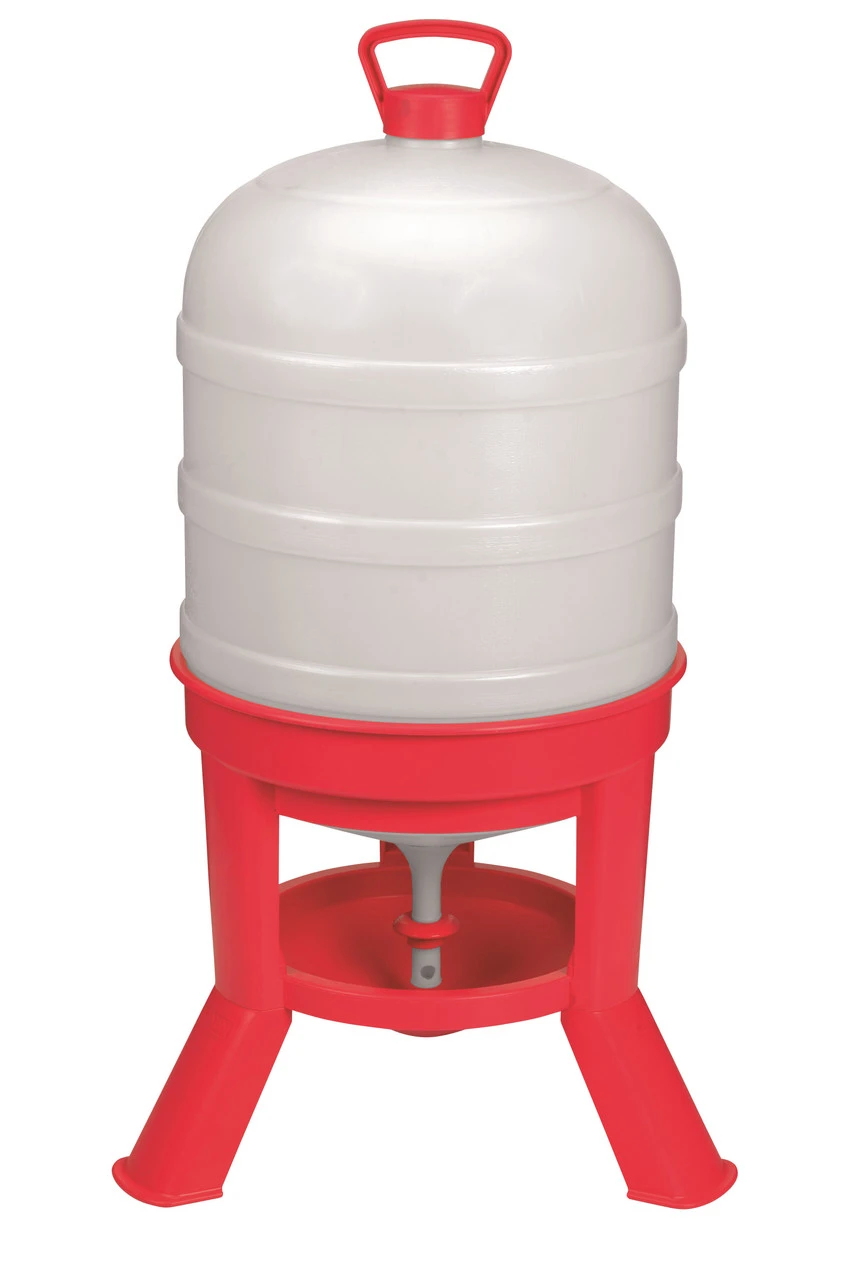 Best suited for adult birds. Made of strong, heavy-duty plastic. Top-fill design is easy to use. Valve in base controls water flow close when filling, then open to allow water to fill the base. For best results, set waterer on flat ground before filling. Accommodates between 80-100 chickens, also good for ducks or other poultry. Holds up to 8 gallons of water.