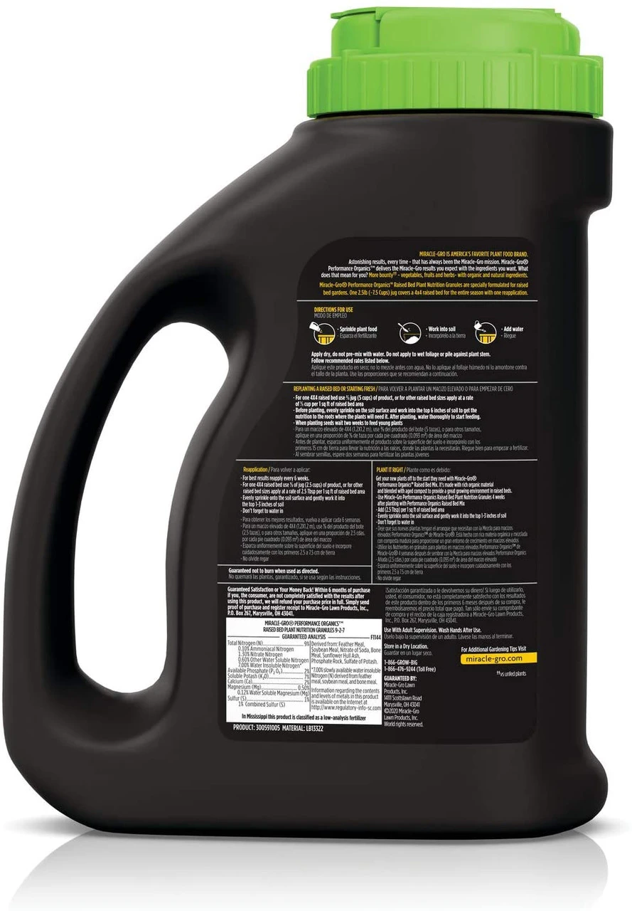 - Use Miracle-Gro Performance Organics Raised Bed Plant Nutrition Granules to feed vegetables, fruits, herbs, and flowers grown in raised beds