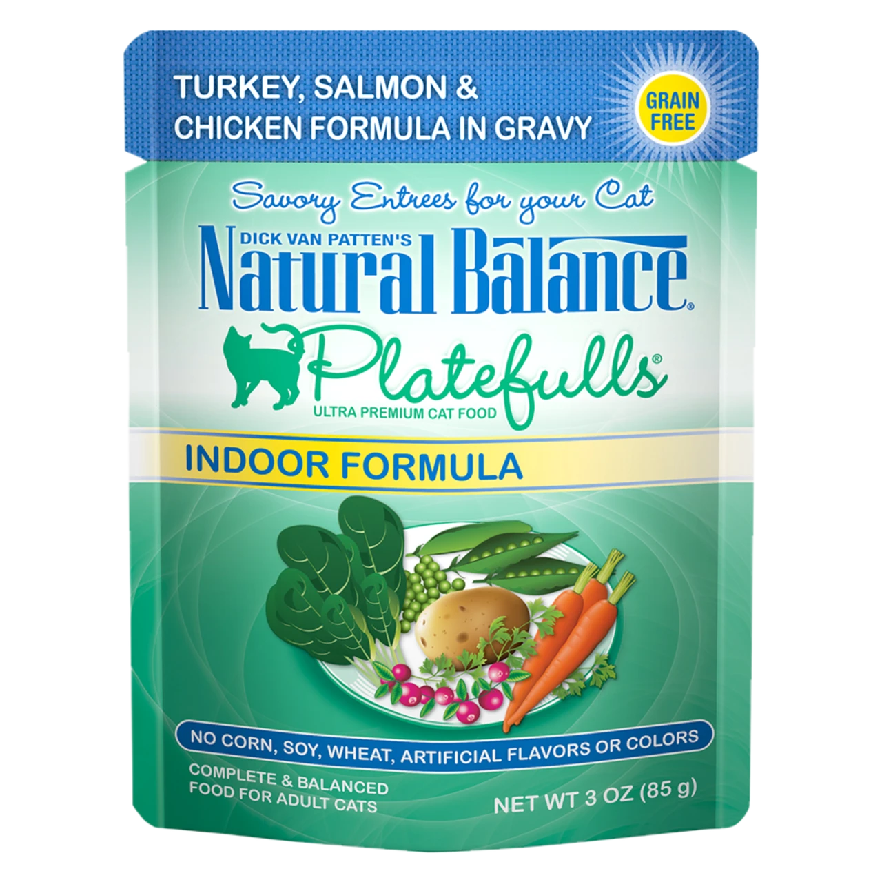 Dick Van Patten’s Natural Balance® Platefulls® Indoor Turkey, Salmon & Chicken Formula in Gravy Cat Food is formulated to meet the nutritional levels established by the AAFCO Cat Food Nutrient Profiles for Adult Maintenance.