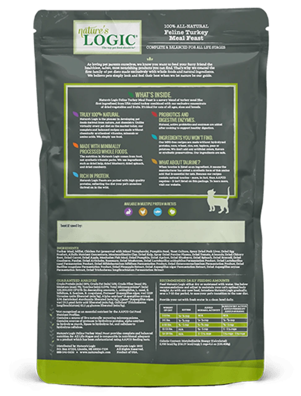 Natureās Logic Feline Turkey Meal Feast is a savory blend of turkey meal (the first ingredient) from USA-raised turkey combined with our exclusive concentrate of dried vegetables and fruits. Itās ideal for cats of all ages, sizes, and breeds.