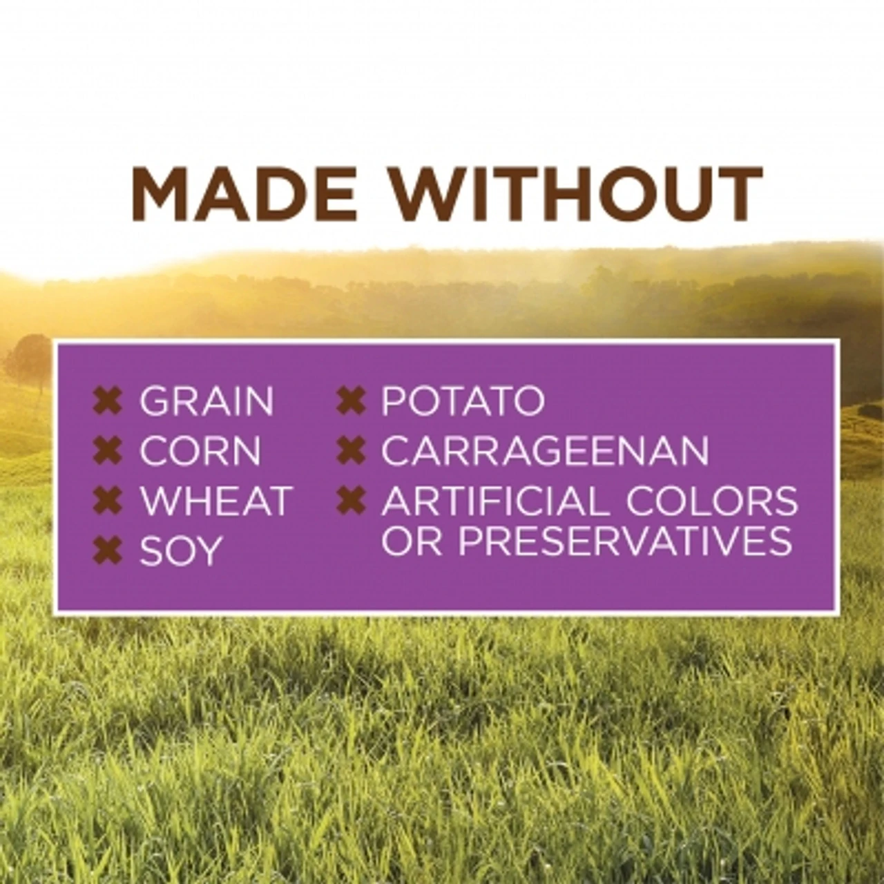 - Made without – grain, potato, corn, wheat, soy, artificial colors or preservatives