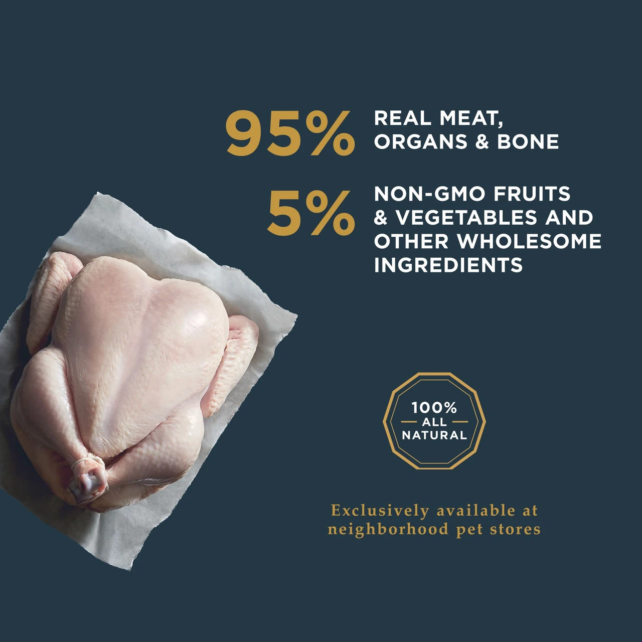 100% all natural, minimally processed, never cooked to keep nutrients pure and intact. Crafted from 95% meat, organ and bone and 5% vegetables, fruits and wholesome ingredients. We believe nutrition should come from real ingredients like cage-free chicken and non-GMO fruits and vegetables. We are proud to share these recipes with our pets and yours.​