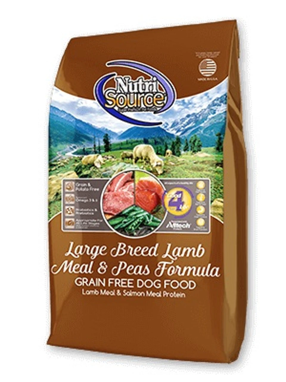 - As a member of our grain free series of dog foods, NutriSource Large Breed Lamb & Peas Dog Food is formulated to meet AAFCO guidelines for all life stages.