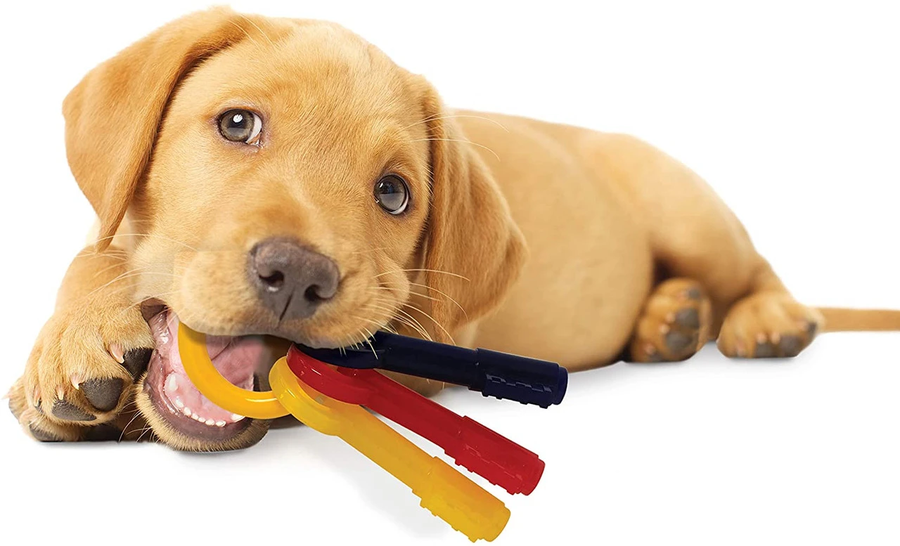 Help your teething puppy learn positive chewing habits from the start with our Just for Puppies Teething Puppy Keys! Designed for large pups, this soft dog chew toy encourages nondestructive chewing routines while satisfying the natural urge to chew. The bristles on this bacon chew toy help clean teeth and prevent plaque and tartar, giving your dog a brighter, healthier smile! Go ahead and throw your puppy a Nylabone!
