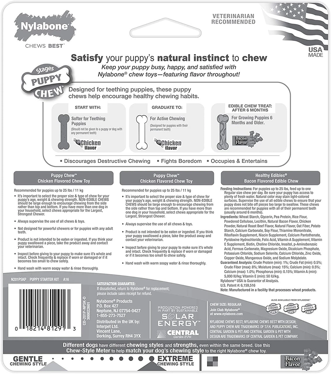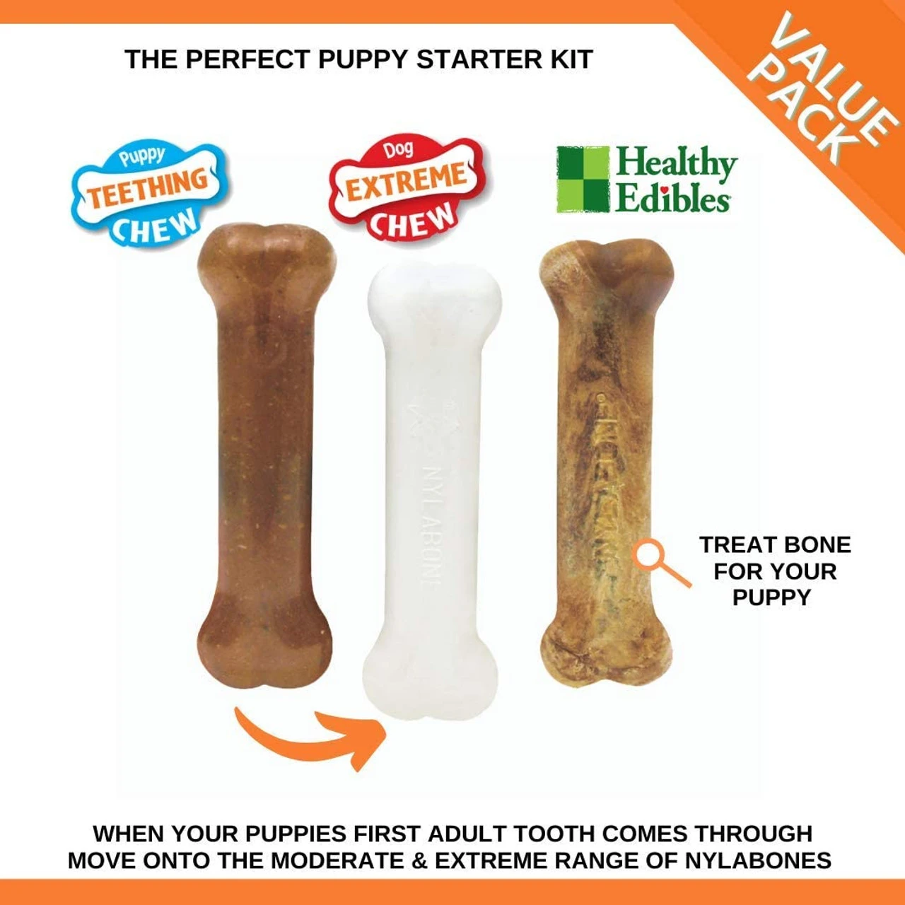 Introduce your puppy to the Nylabone family of products and develop healthy chewing habits right from the start! The Puppy Chew Toy and Treat Starter Kit includes a soft, chicken flavored Puppy Bone for teething puppies, a Power Chew Dura Chew chicken flavored bone for puppies starting to get their permanent teeth, and a Healthy Edibles bacon puppy treat just for puppies six months and older. Chew toys and treats help promote dog dental health and satisfy your puppy’s natural instinct to chew.