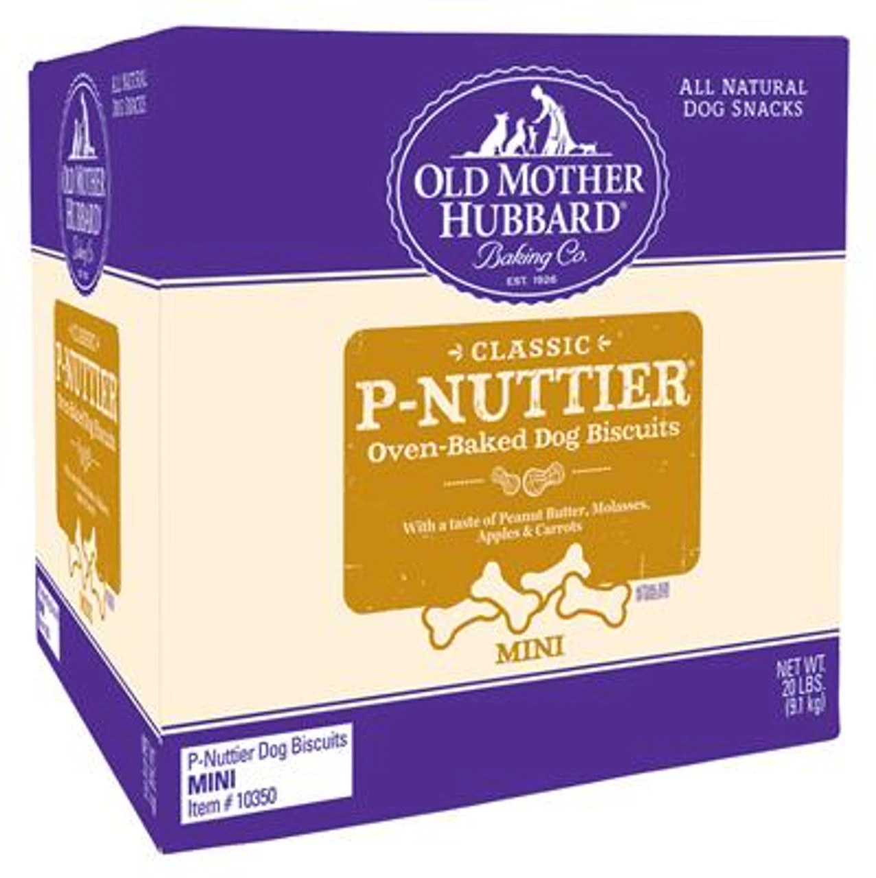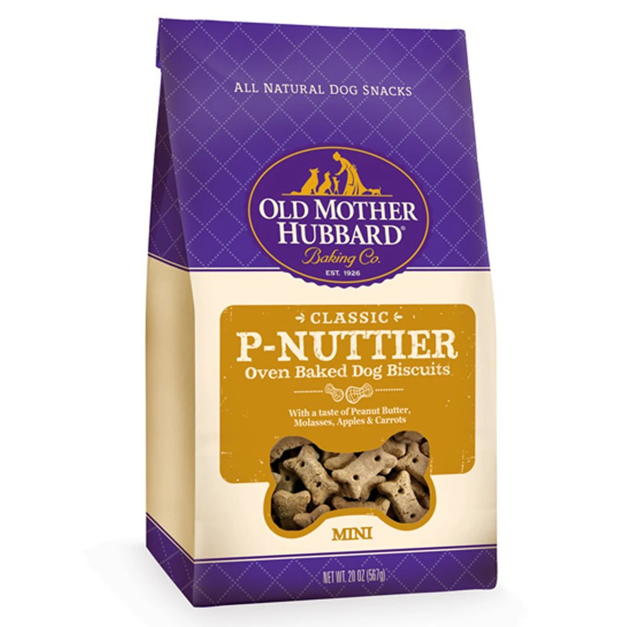 Old Mother Hubbard Crunchy Classic Natural Dog Treats are wholesome, all natural dog bone shaped dog biscuits oven-baked to preserve the natural flavors in all the varieties dogs love to catch, chew and eat. These P-Nuttier natural dog biscuits feature all natural ingredients, natural flavor with the delicious taste of peanut butter, molasses, apples and carrots, as well as a fun dog bone shape and natural crunch your dog will really enjoy. Dog biscuits, treats and snacks are a great addition to a healthy diet. Snack time is a mutually rewarding show of love and positive reinforcement with your dog. You can feel good about training and rewarding your dog with Old Mother Hubbard natural dog treats.