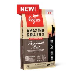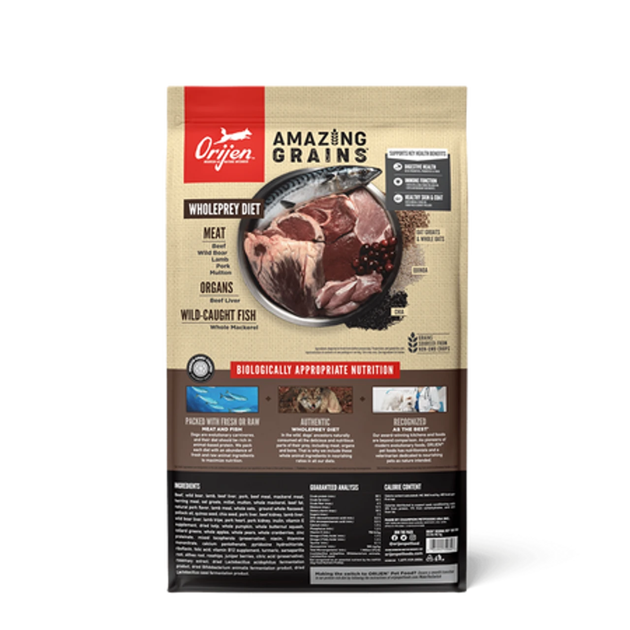 ORIJEN® Amazing Grains is packed with fresh or raw animal protein and enhanced with hand-selected grains to give your dog peak nourishment. With 90%* premium animal ingredients, ORIJEN Regional Red with Amazing Grains includes WholePrey ingredients from beef, wild boar, goat, lamb and wild-caught mackerel. These nutrient-dense animal ingredients provide your dog with the protein, vitamins and minerals they need to thrive. We’ve also added only the most amazing grains in a high-quality blend of oats, quinoa and chia and more, hand-selected to provide a balanced fiber ratio that helps support your dog’s digestive health. Nourish your dog completely with the amazing animal protein and quality grains found in ORIJEN Amazing Grains.