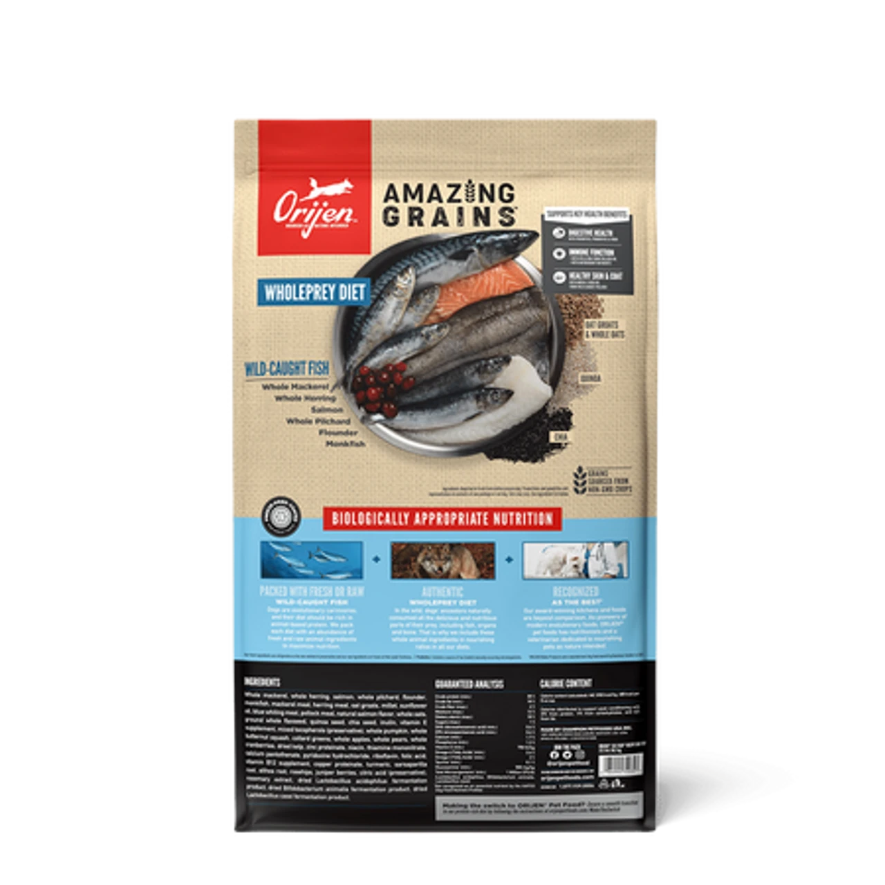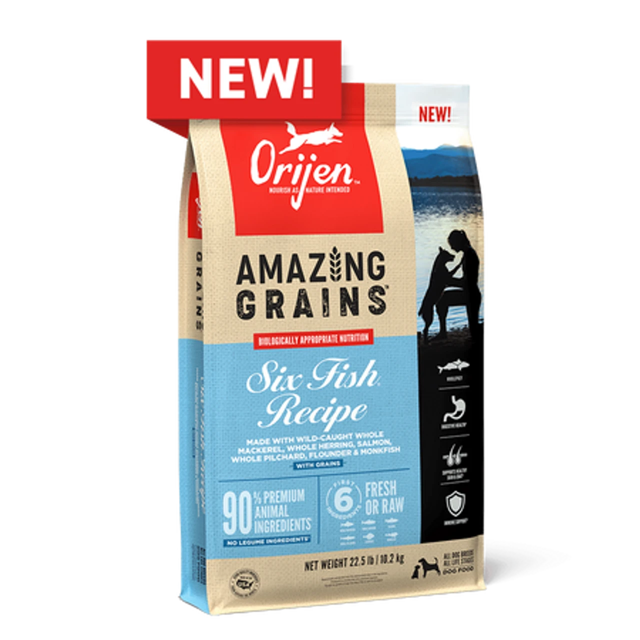ORIJEN® Amazing Grains is packed with fresh or raw animal protein and enhanced with hand-selected grains to give your dog peak nourishment. With 90%* premium animal ingredients, ORIJEN Six Fish with Amazing Grains includes WholePrey ingredients from wild-caught whole mackerel, whole herring, monkfish, acadian redfish, flounder and whole hake. These nutrient-dense fish ingredients provide your dog with the protein, vitamins and minerals they need to thrive. We’ve also added only the most amazing grains in a high-quality blend of oats, quinoa and chia and more, hand-selected to provide a balanced fiber ratio that helps support your dog’s digestive health. Nourish your dog completely with the amazing animal protein and quality grains found in ORIJEN Amazing Grains.