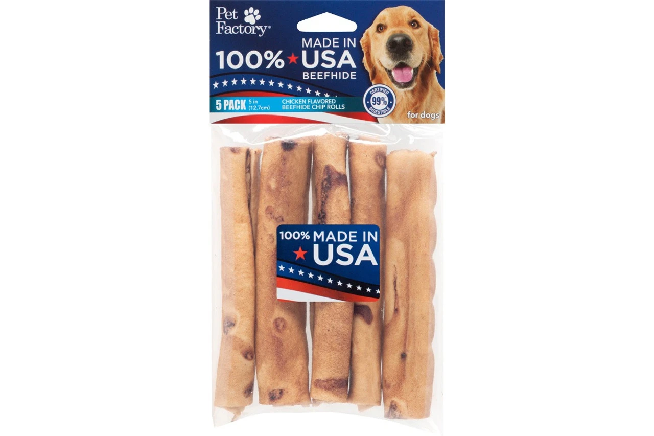 Pet Factory 100% USA Beefhide Chicken Flavored Chip Rolls 5″ 5pk
