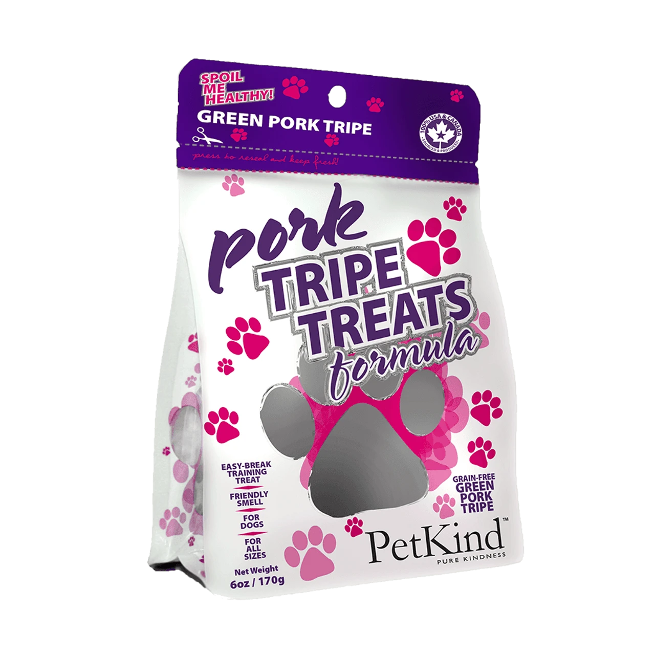PetKind Green Pork Tripe Treats includes the benefits of green tripe, in a convenient to feed and friendly smelling format. This product is easy to break into training-size pieces, and can be fed to dogs of all sizes.
