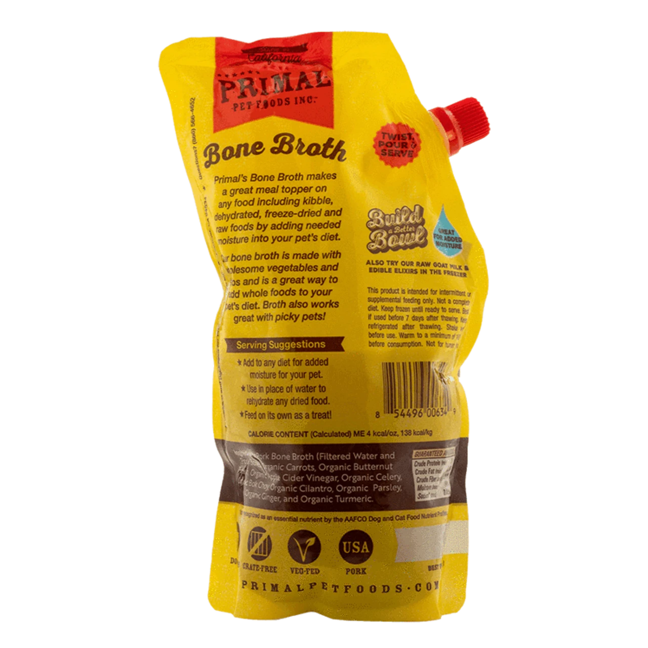A hydrating, wholesome addition to any diet—plus beneficial nutrients to support joint health, digestion, and liver health. Suitable for dogs or cats. Bone Broth is available in 20oz. easy-pour resealable pouches.