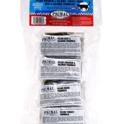 Primal’s Frozen Feline Starter Packs are the perfect way to introduce your cat to a raw diet! With these Starter Packs you get four of Primal’s raw formulas for your cat to try! Primal provides your cat with convenient ready-to-serve raw frozen meals that are complete and balanced and packed with protein and nutrition! No measuring or mixing required! It’s as easy as thaw and serve! Primal only uses the highest quality humanely and sustainably-sourced ingredients to provide your pet with healthy and flavorful nutrition! Made with pure meat, organ, ground bone, and organic produce for a nutritious and delicious meal! Ground bone is a great natural source of calcium to keep your pet’s teeth and bones strong! Features four individually vacuum-sealed bags of three 1 oz. frozen nuggets for each protein formula. Each Feline Starter Pack contains Beef & Salmon, Chicken & Salmon, Pork, and Turkey formulas. The small nugget size make are ideal for easy serving and easy eating! Your kitty will be meowing for more of these delicious raw meals! Made in USA.Â